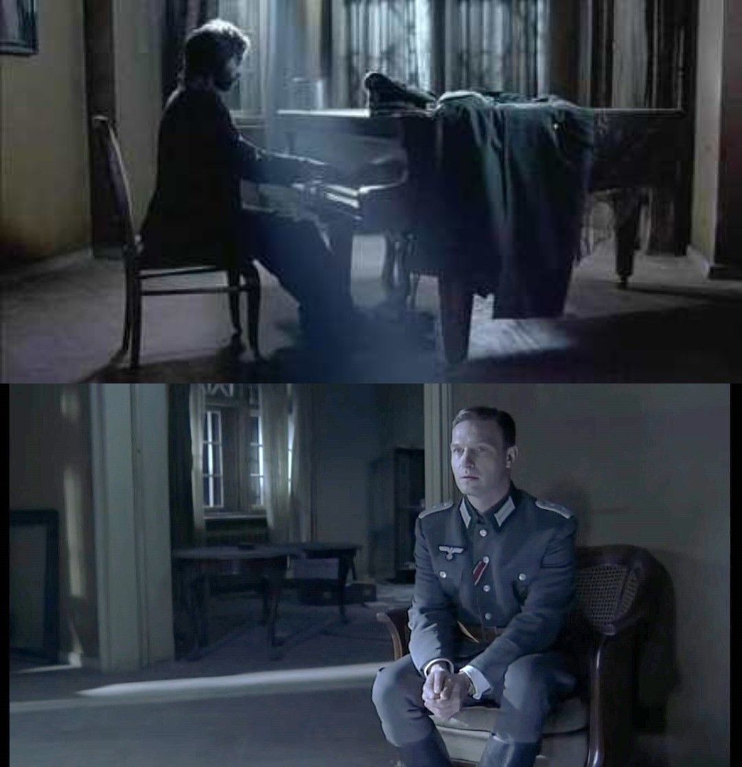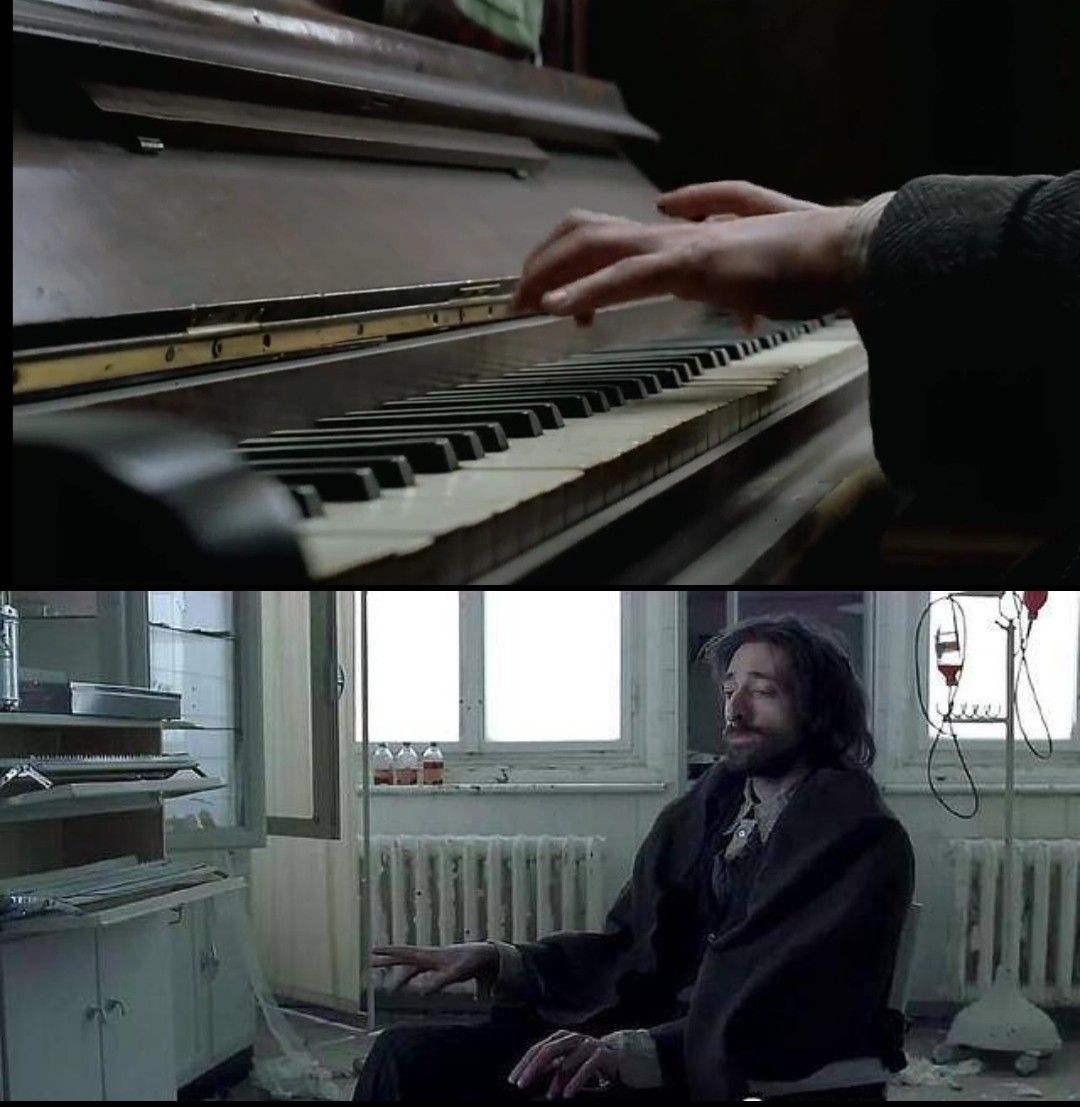第四处,是破医院空气里的叙一。难得寻到一点食物果腹、享受一刻安宁,席皮尔曼在空气里弹起了叙一。即便身陷苦难,他的心里仍有音乐,仍有希望