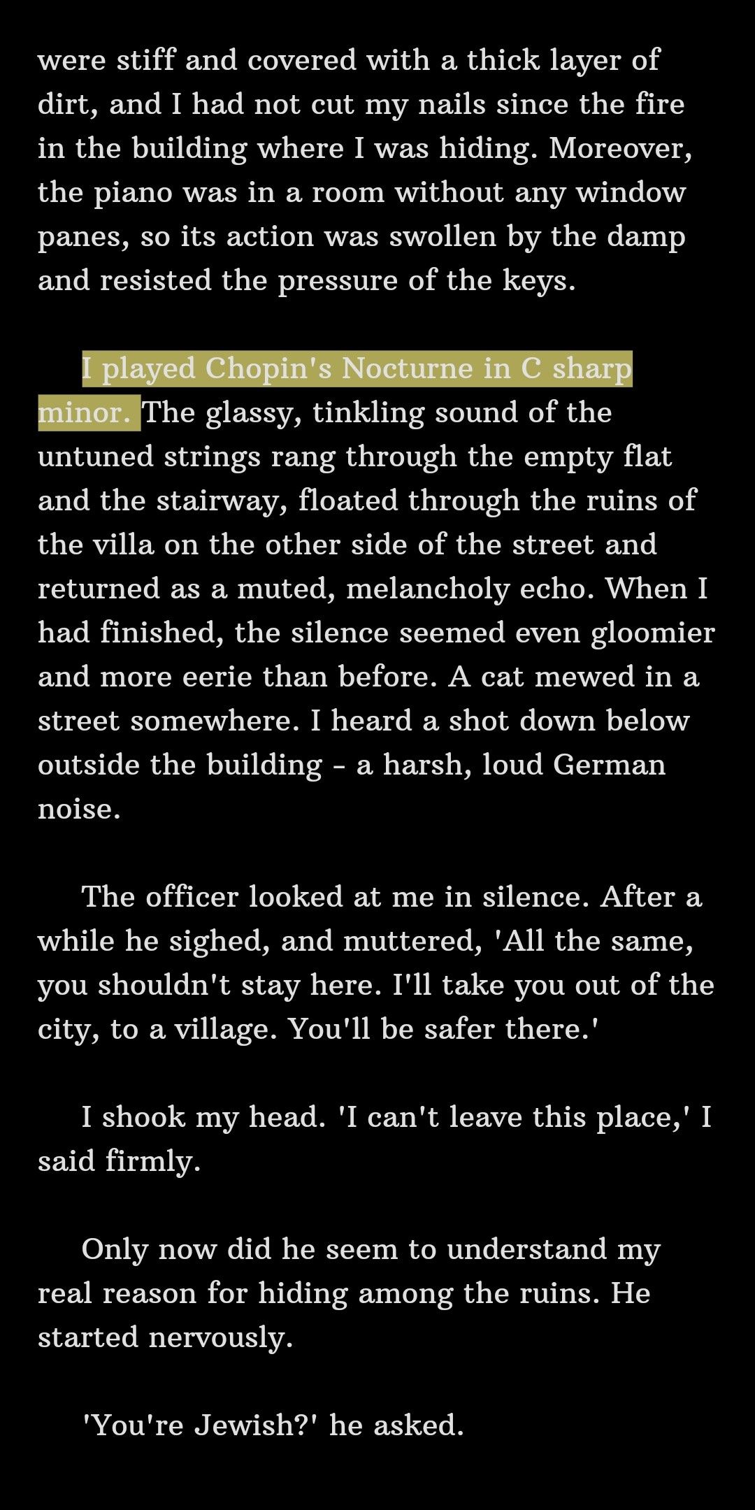 今天读了波兰钢琴家 Wladyslaw Szpilman 的回忆录《The Pianist》(即《The Death of a City》【原书名取自第十六章】,1946年出版。因为“显而易见的原因”而被政治当局查禁,直到九十年代才以“The Pianist”为书名再次出版)