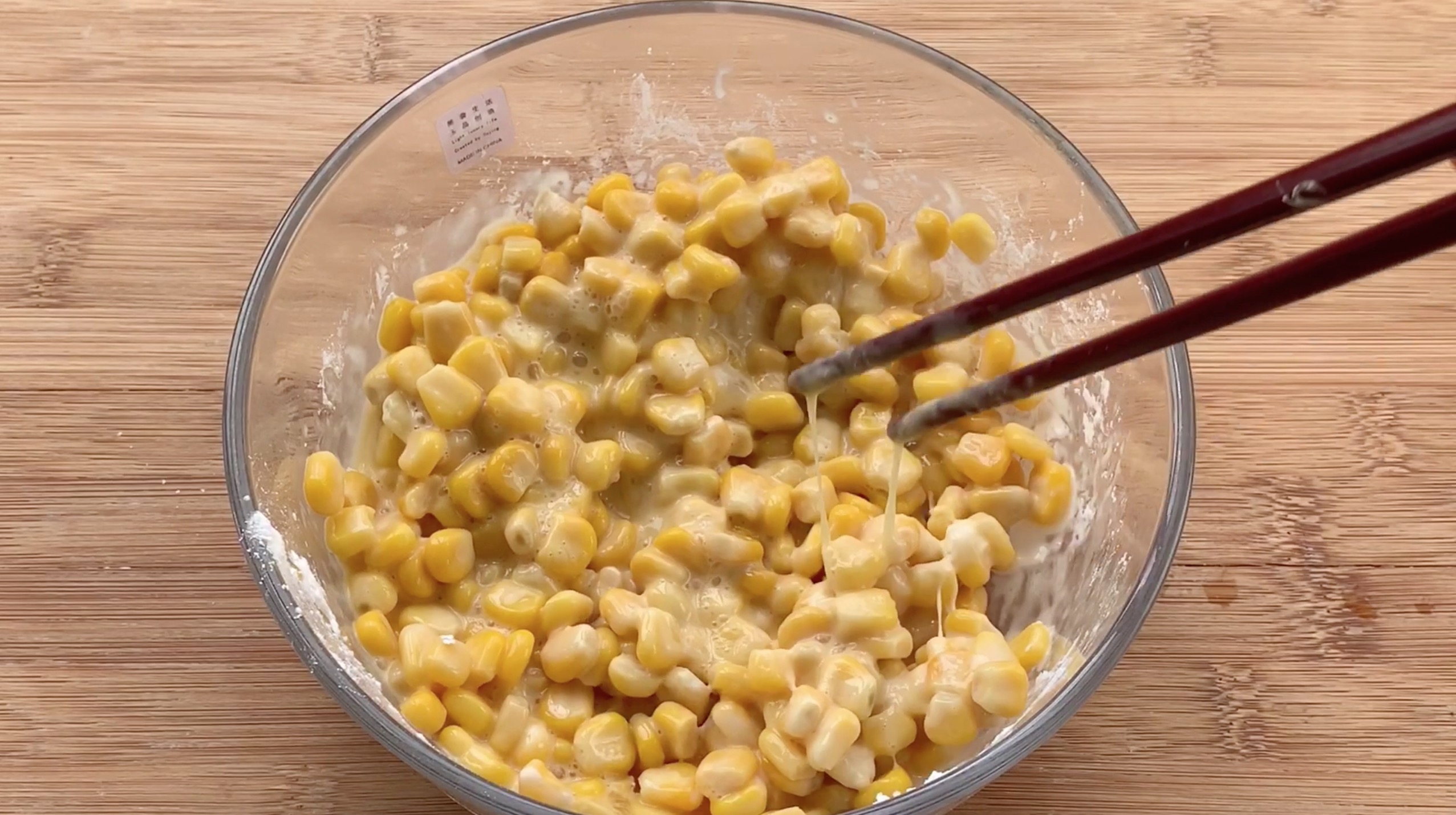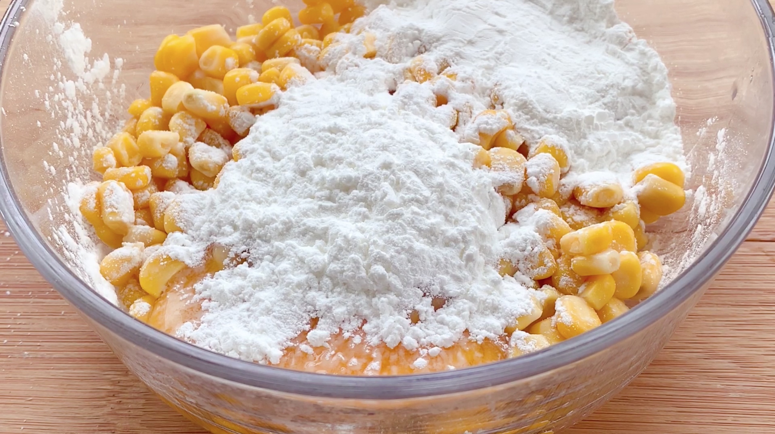 * 玉米放入大碗中,放入鸡蛋、玉米淀粉、盐充分搅拌