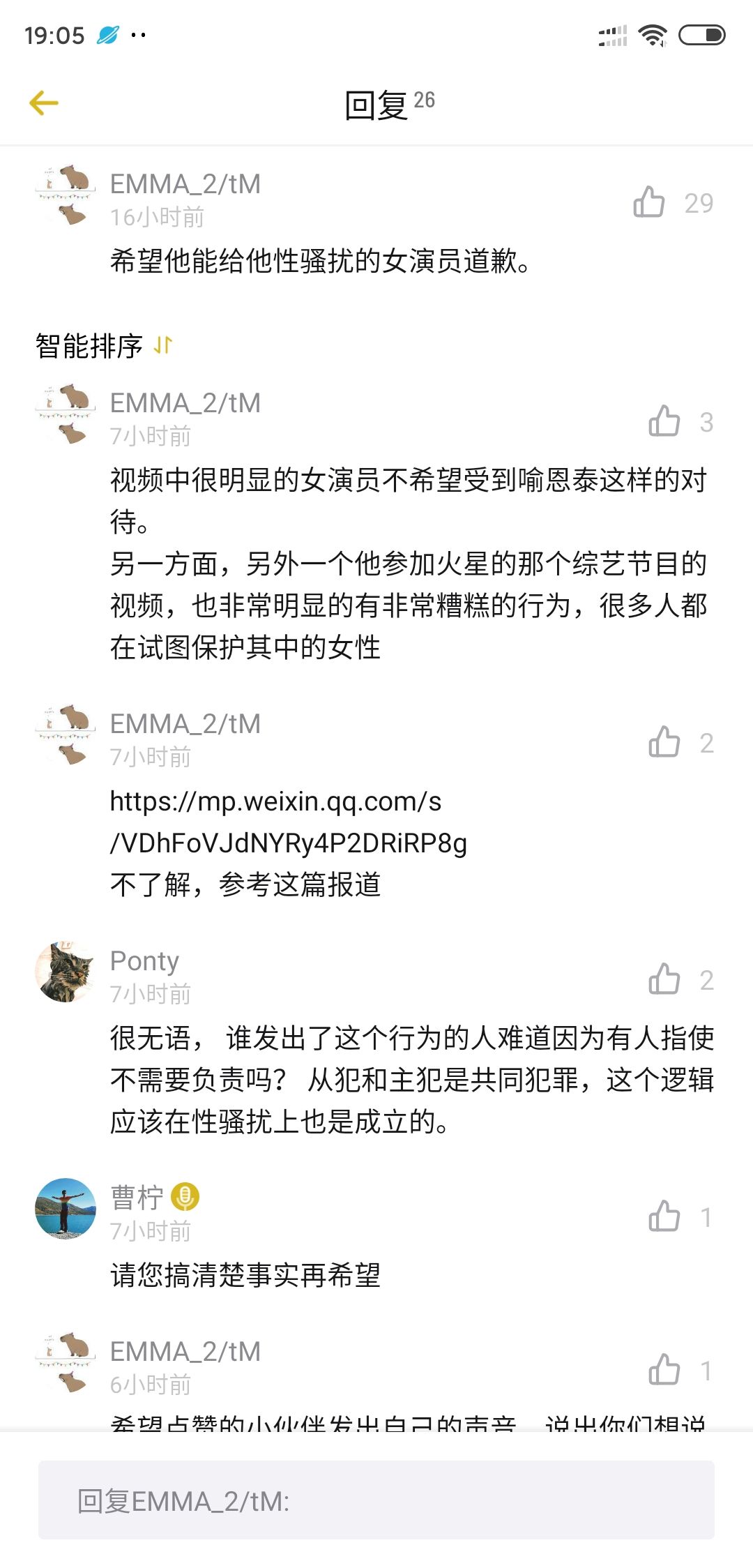然后,评论区某位听众要求喻恩泰为性骚扰道歉,主持人曹柠引了导演的话进行反驳,但该反驳非但没有平息争论,反而引发了更多听众质疑。