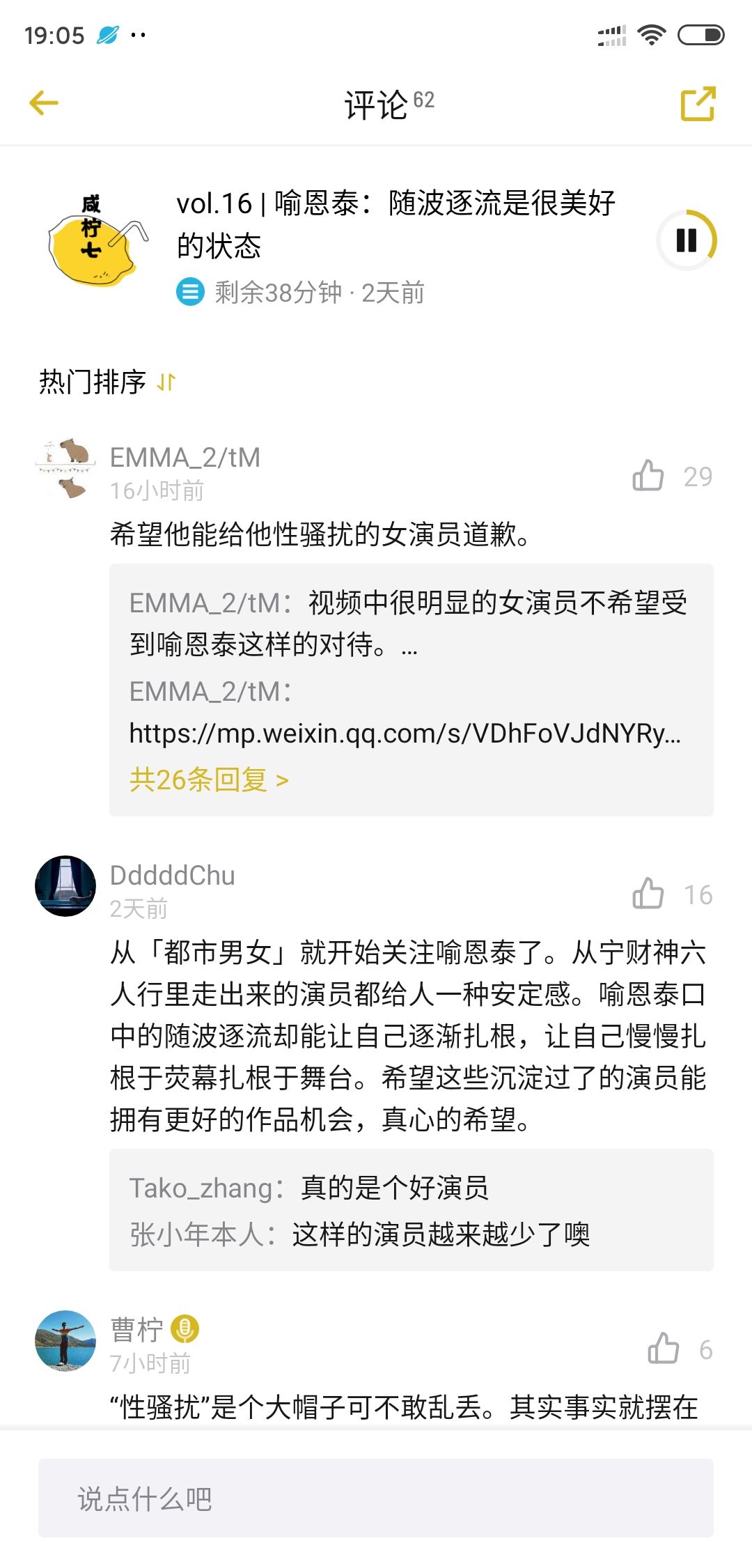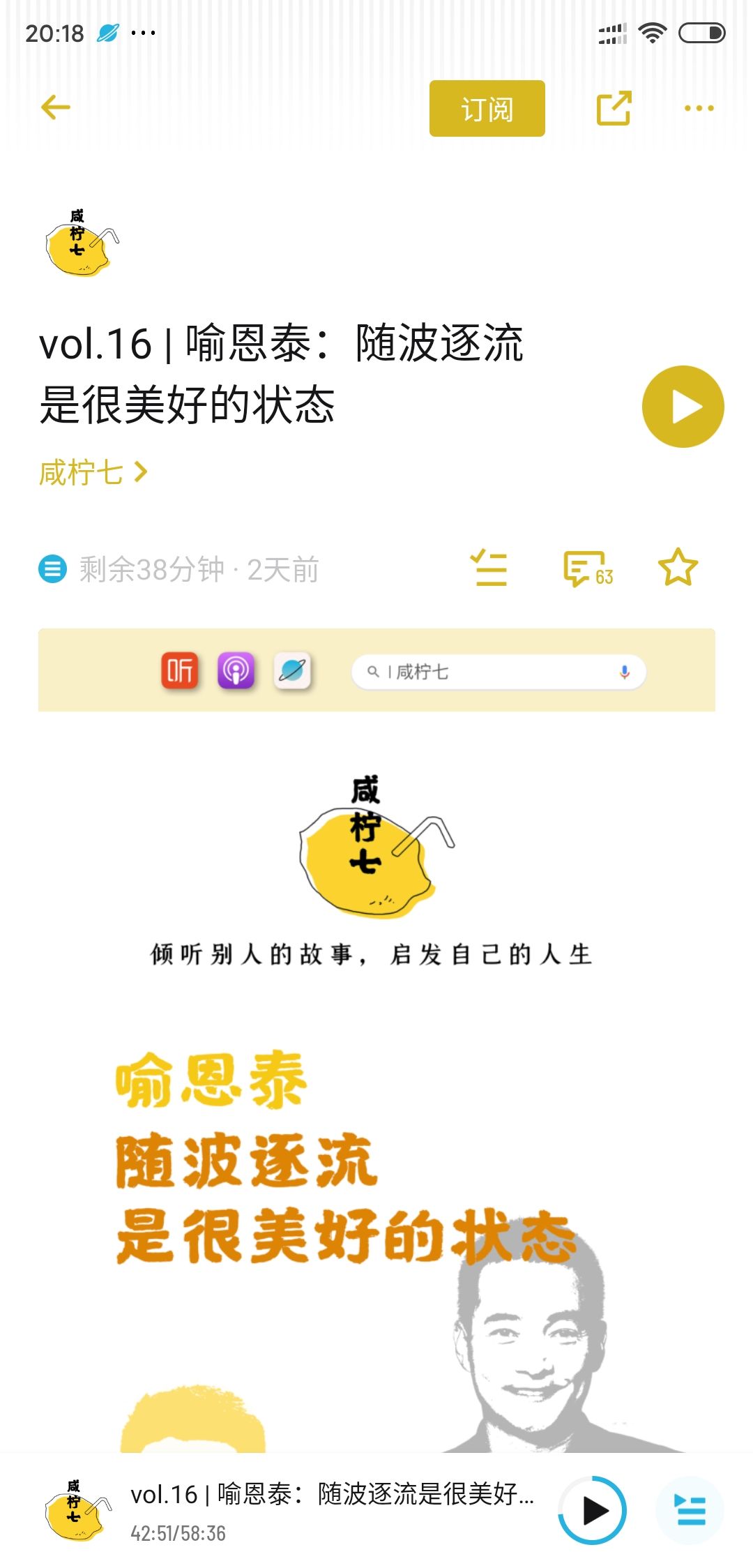 这期播客是咸柠七采访喻恩泰的记录,节目里,主持人提到了喻恩泰前段时间的性骚扰事件,喻恩泰做了一些回应。