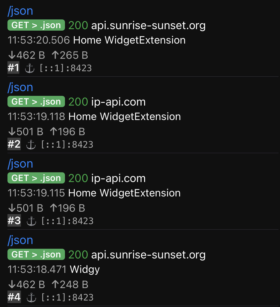 #我的桌面小部件 用Widgy拖了一个桌面小组件出来(图1),一开始拖的时候我还纳闷为什么我的日出日落时间和Sky Guide不一样(图2),后来发现关了代理就正常了,抓包一看它是请求IP-API反查经纬度,再通过经纬度去查日出日落时间(图3),所以在代理里面把ip-api.com策略改成直连才好用。