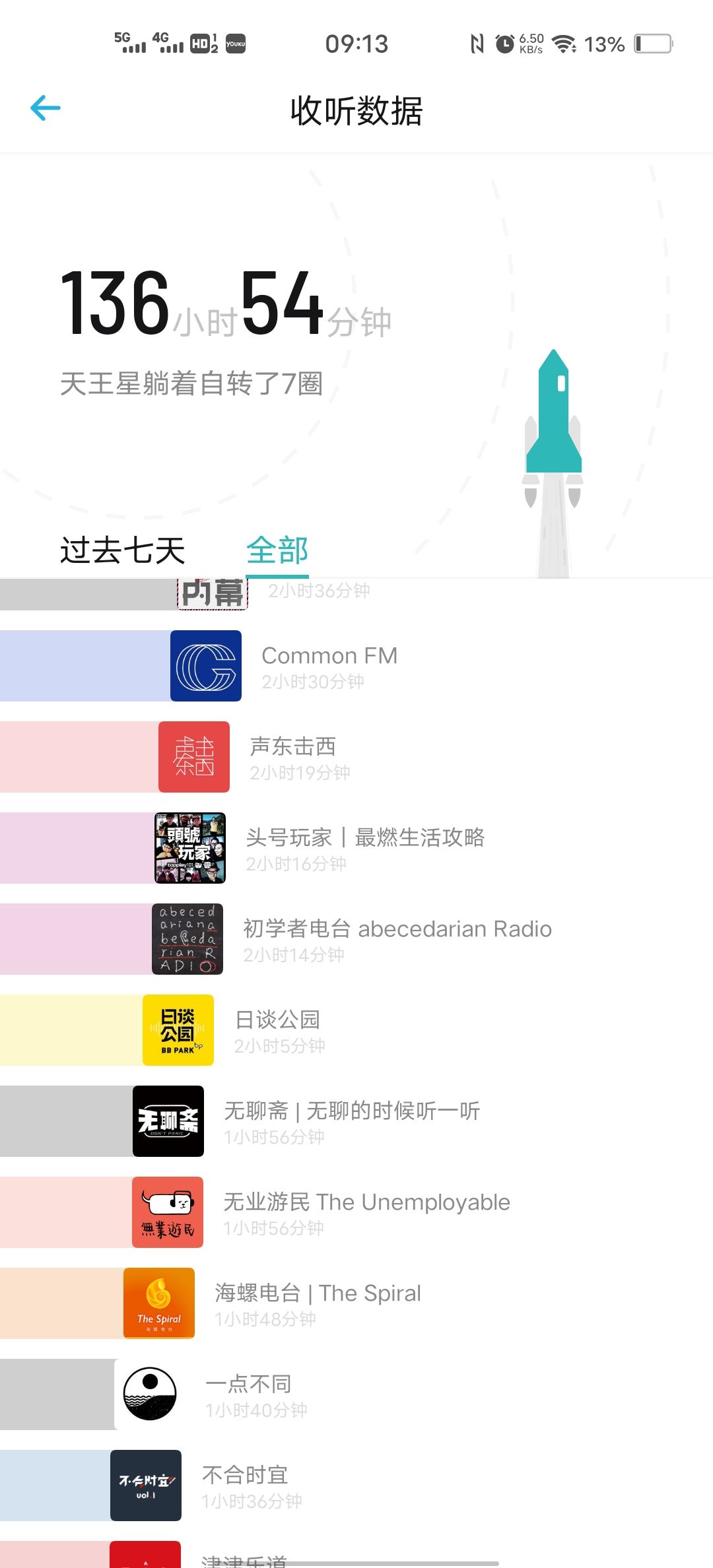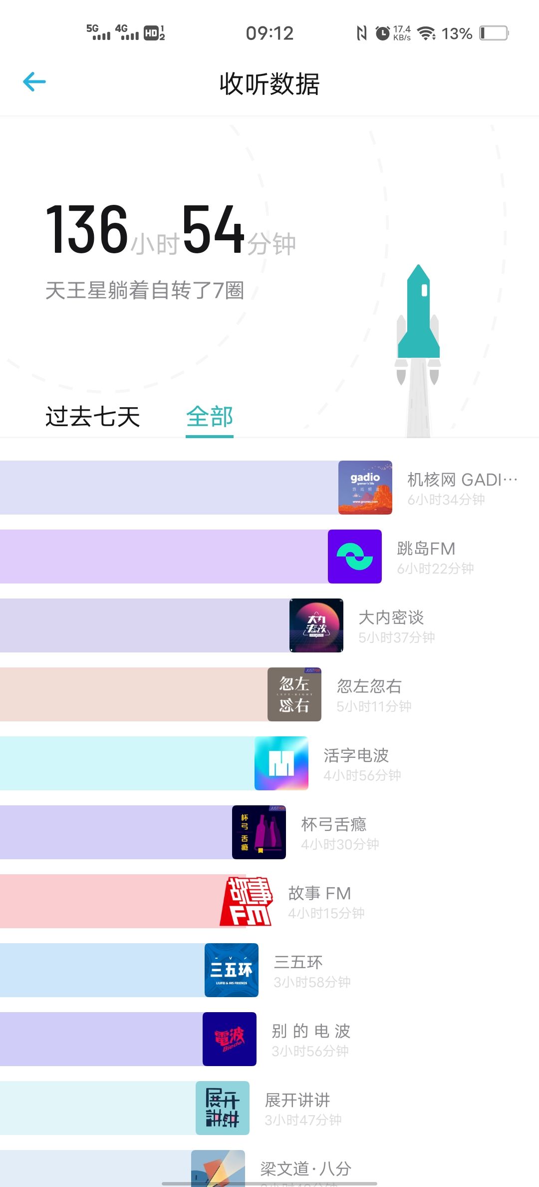 杂谈类:《大内密谈》、《别的电波》、《随机波动》、《忽左忽右》、《子非鱼》、《故事FM》、《车间访谈》、《nice try》、《更读小二楼/头号玩家》