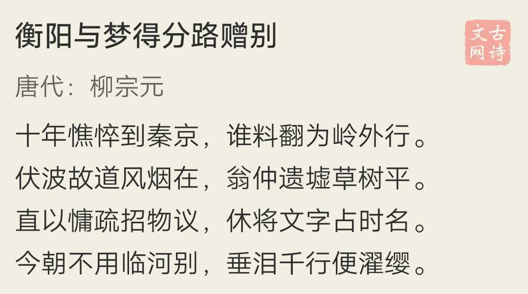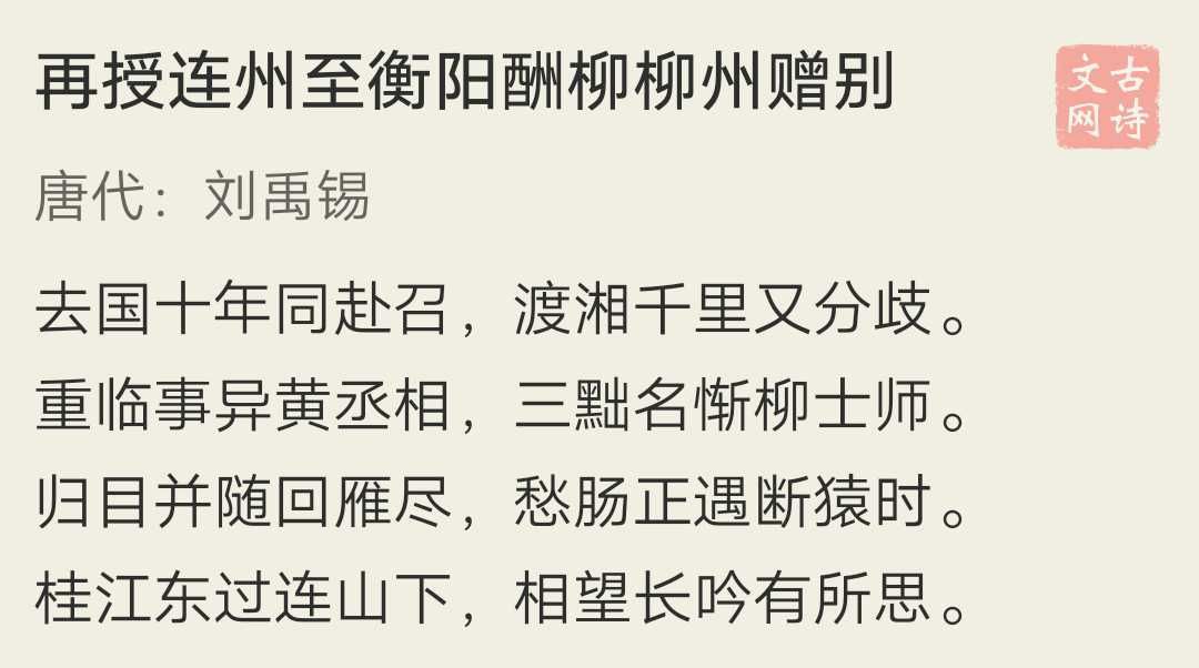 刘柳二人当年一起参加“永贞革新”,之后一起被贬。十年后回到京城,刘禹锡写了句“玄都观里桃千树,尽是刘郎去后栽”,二人再次被贬,这就是被贬途中分别时的唱和。