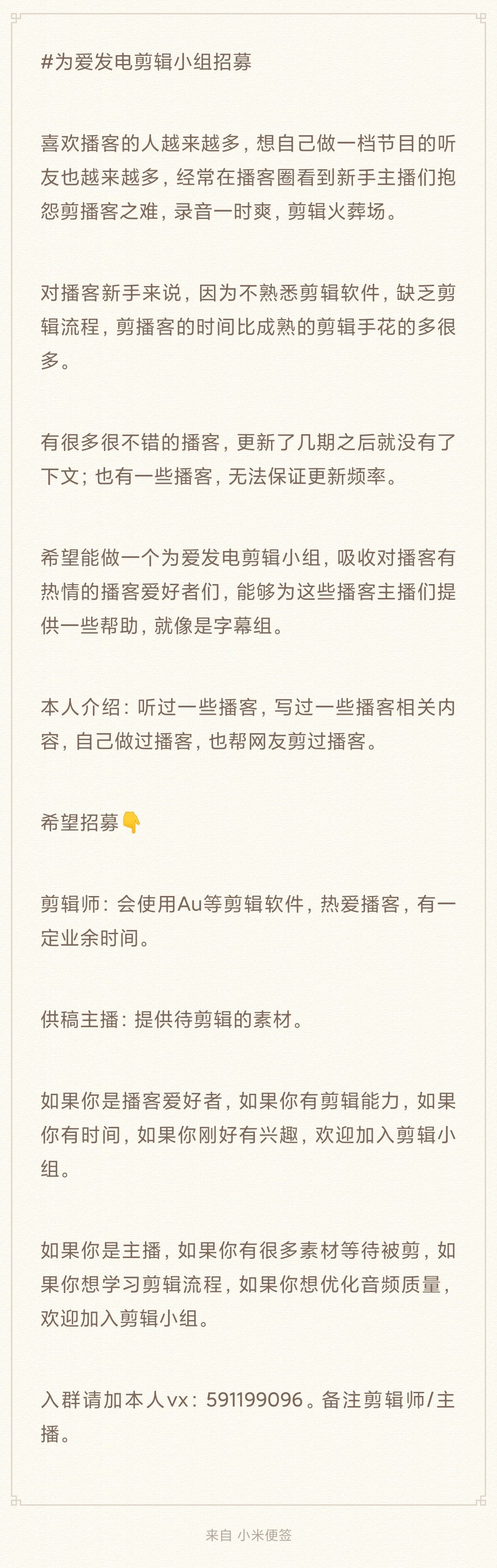 希望能做一个为爱发电剪辑小组,吸收对播客有热情的播客爱好者们,能够为这些播客主播们提供一些帮助,就像是字幕组。