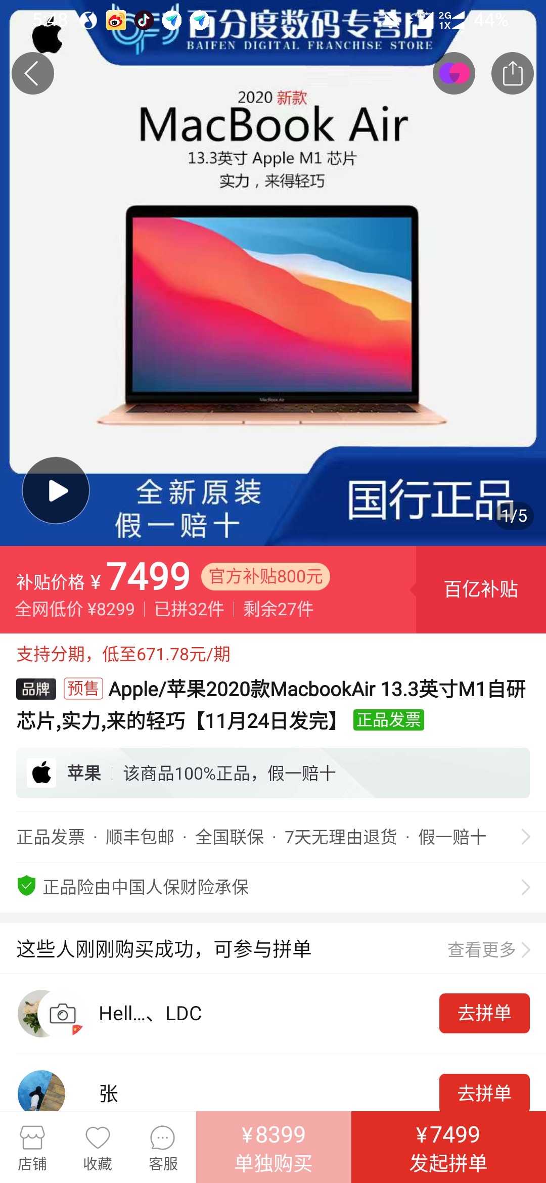 【MacBook Air/Pro M1芯片版上架拼多多,最高比官网便宜 700 元】