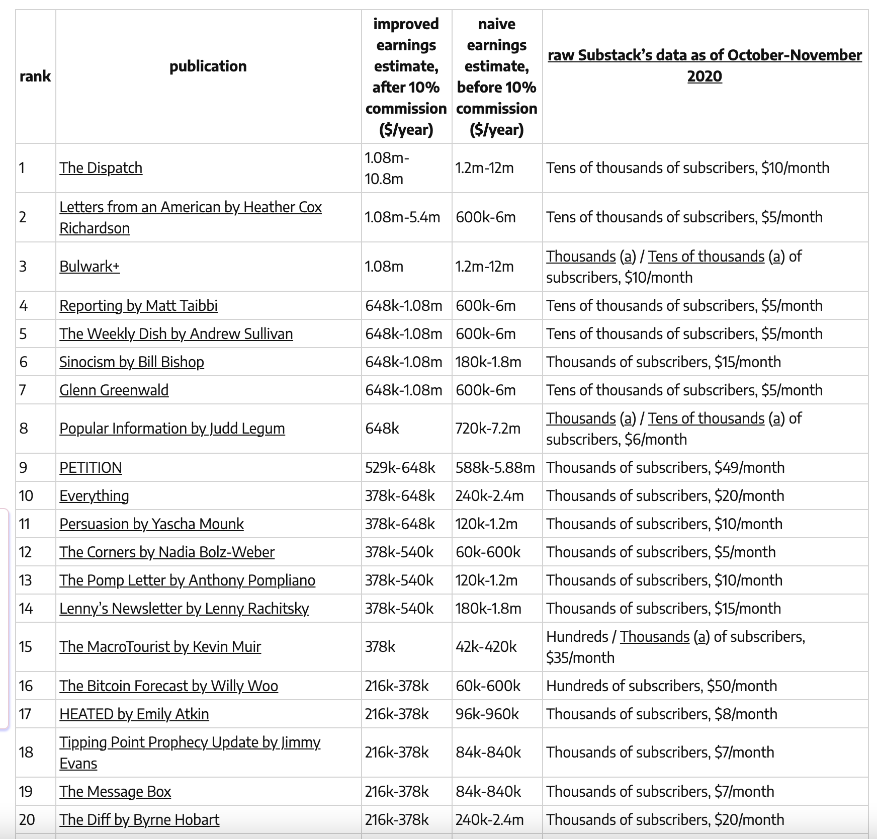 #播客笔记# 付费邮件平台 Substack 的 CEO Chris Best 在采访中表示,公司目前有 20 个员工,付费读者超过 10 万,收入前十的作者加起来年收入 1000 万美元。我看到有网友根据 Substack 公布的排名估计了作者收入。大概有七八位在百万这个级别。前 20 的作者以前记者为主。他们写的都是时评,且方向都偏自由派。还有四位写投资,两位写华盛顿政治从业者关心的内容,两位写宗教祷告,一位写气候变化。