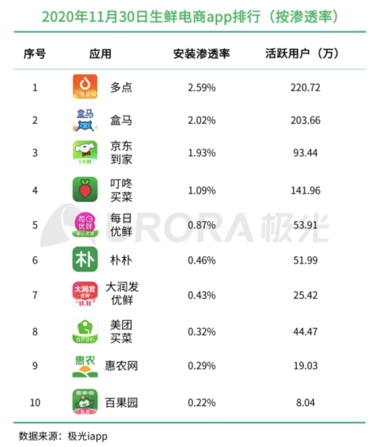 2020.11.30中国生鲜电商app排行(按渗透率)