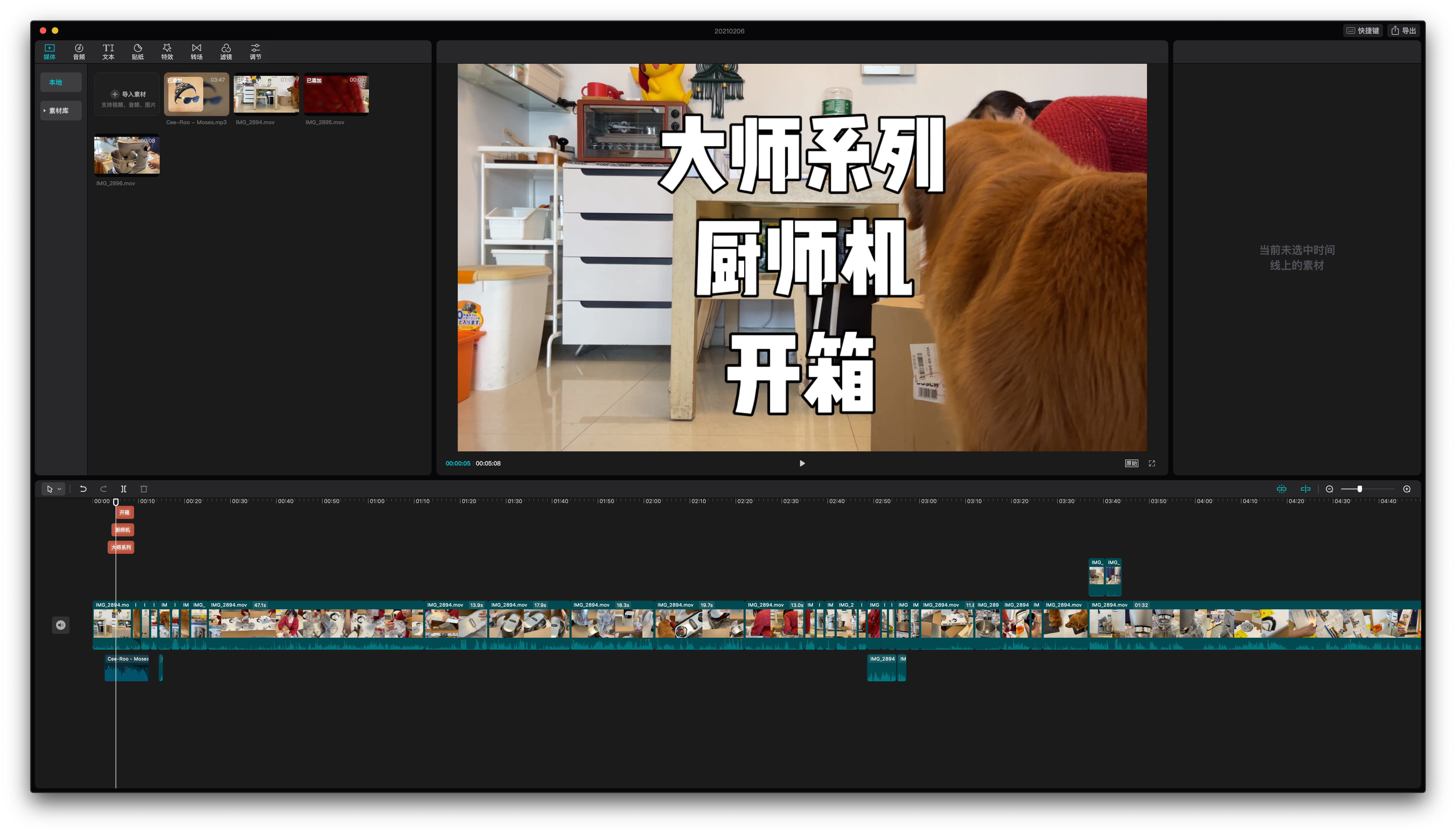 尝试了一下剪映 for Mac,在我的小破 iMac 上,到这个程度预览已经不跟光标,有点卡到影响剪辑体验了。