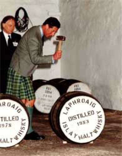 1994年,查尔斯王子出于视察当地企业的目的,乘机来到位于艾雷岛的拉弗格酒厂,但由于遭遇侧风,飞机在降落时发生了小磨损,被迫在当地进行维修。原定20分钟的酒厂视察之旅也因此延长到了2个小时。酒厂经理自然不会放过这个大好的宣传机会,带着咱们的老王子体验了把酿造全过程,也喝了把扎实的,最后临走前还送了王子两桶酒厂精选的原酒(如图4,拉弗格收藏家的天花板,1978和1983王子桶 - Cask of His Royal Highness)。自此,查尔斯王子一发不可收拾爱上了拉弗格,并允许拉弗格在自己的酒标上印上代表皇室青睐的三根鸵鸟毛翎羽盾徽。