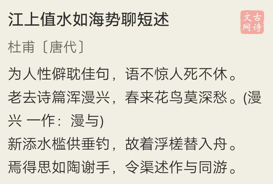 首联“为人性僻耽佳句,语不惊人死不休”即是褒扬自己,高度评价自己的诗文。接下来两联叙事议论,“浑漫兴、垂钓、浮槎”等语,看似闲适,实则在写自己诗歌技法炉火纯青,情之所至,皆可入诗,而不必刻意去向花鸟寻愁。有点武侠高手,到最后“拈花摘叶”皆可伤人的感觉。