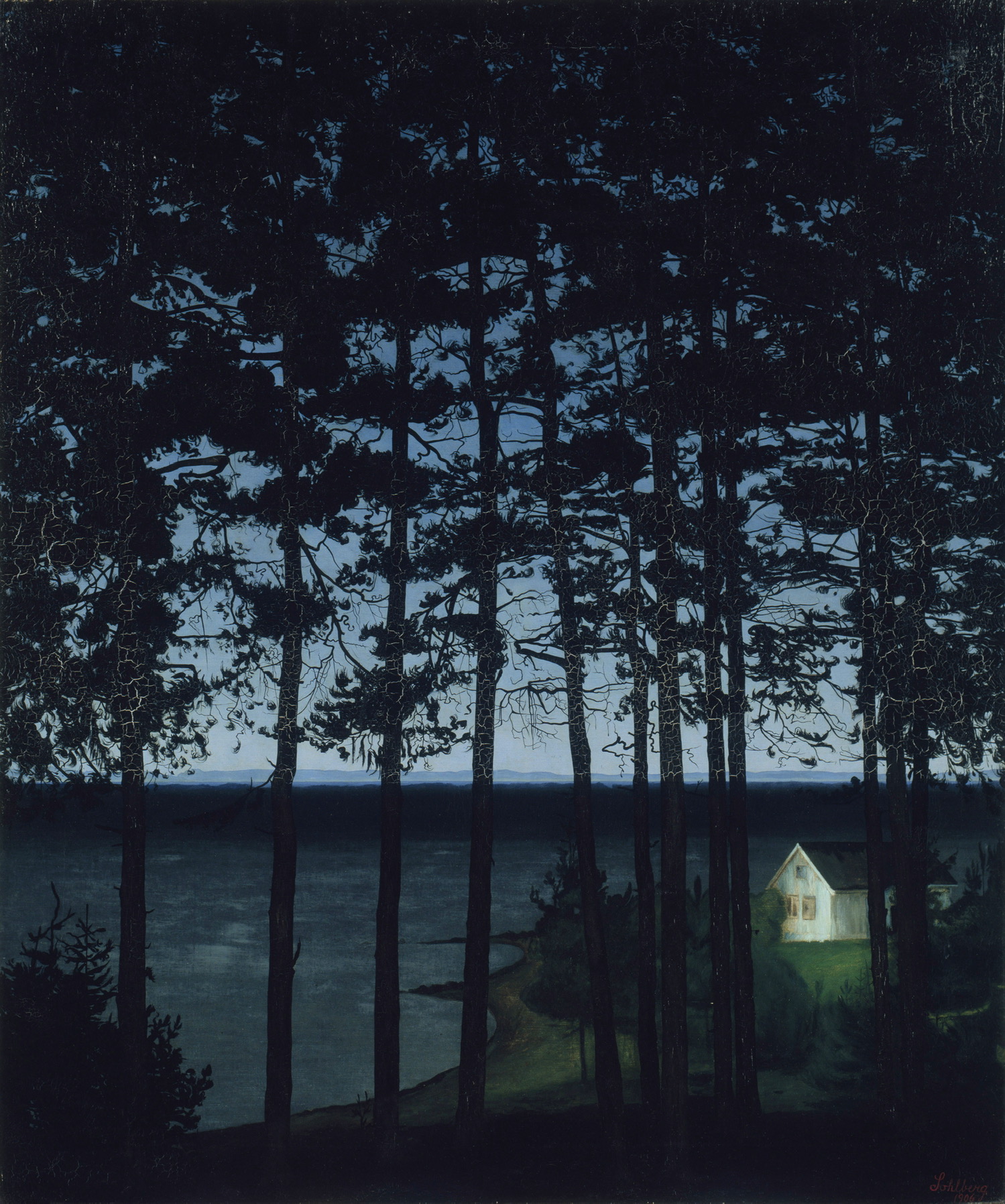 哈拉尔德.索尔伯格是一位象征主义艺术家,他被自然界的美景深深吸引,正是他的祖国——挪威激发了他的创造力。索尔伯格的许多风景绘画中都暗示着人类的存在,却没有描绘出人物形象,反而更加烘托出景致的独特氛围。在这幅画中,索尔伯格把观众当成局外人,在黄昏时低头看着峡湾,小屋内诱人的光线将观众的目光引入原本孤寂的风景中。索尔伯格的作品通常在对细节的微妙关注与自然的崇高之间取得平衡。
