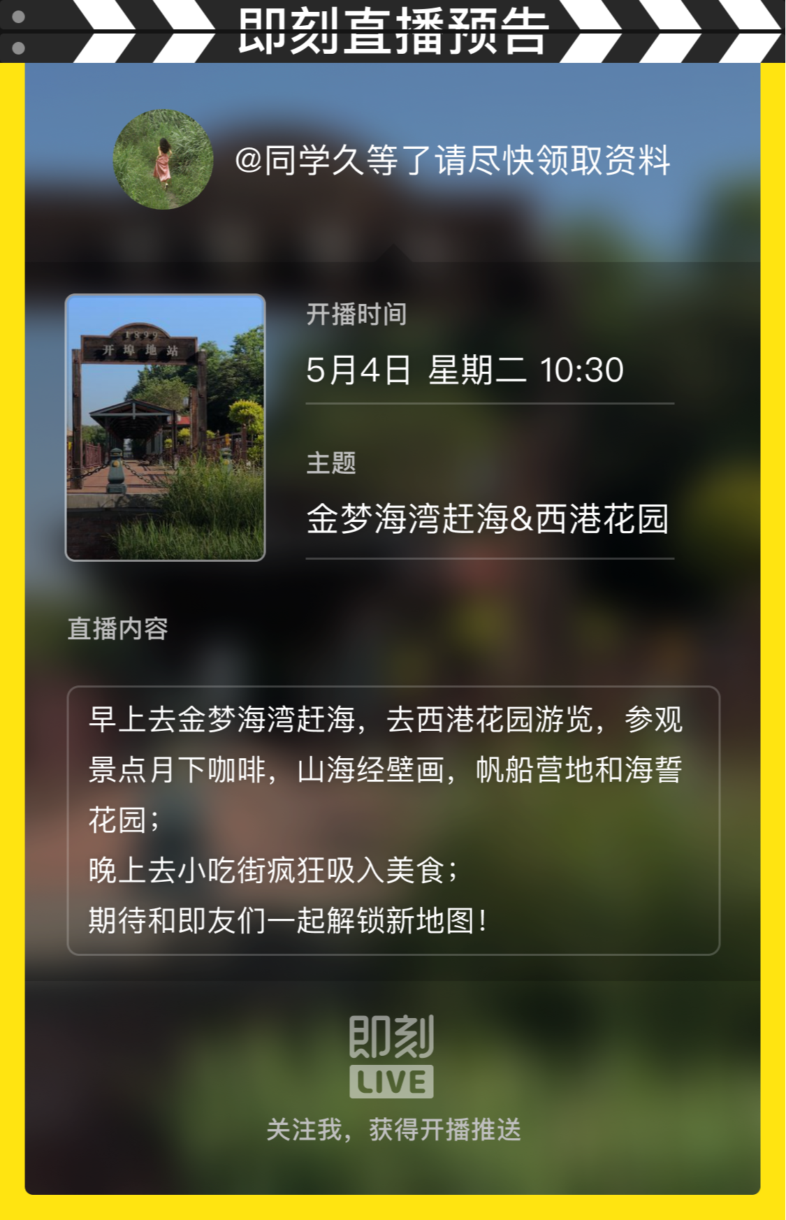 5.4号,早上去金梦海湾赶海,之后去西港花园去游览,主要景点有月下咖啡,山海经壁画,帆船营地和海誓花园。(主要直播地点)大概早晨10点半左右~