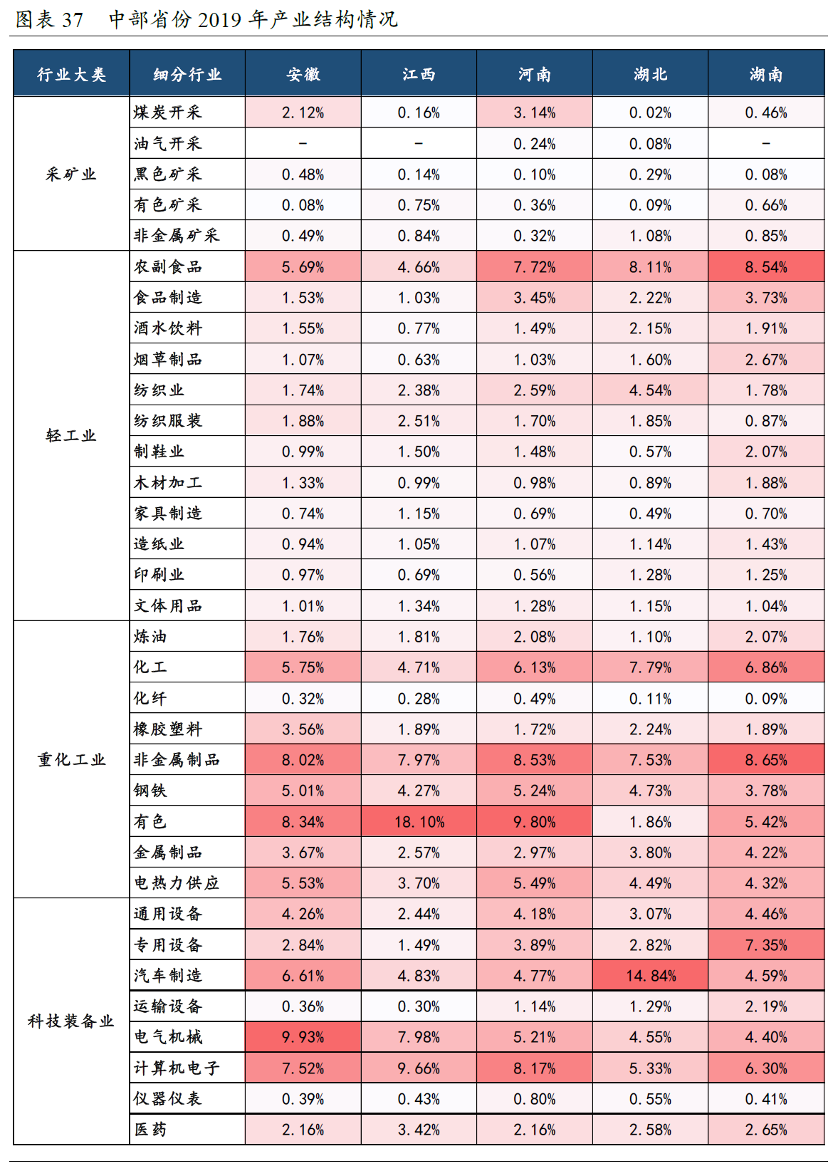 川渝、中部地区则是【高技术制造业和重化工业均衡发展】,川渝地区【依托计算机电子、汽车等产业,有着更高的科技装备业占比】。