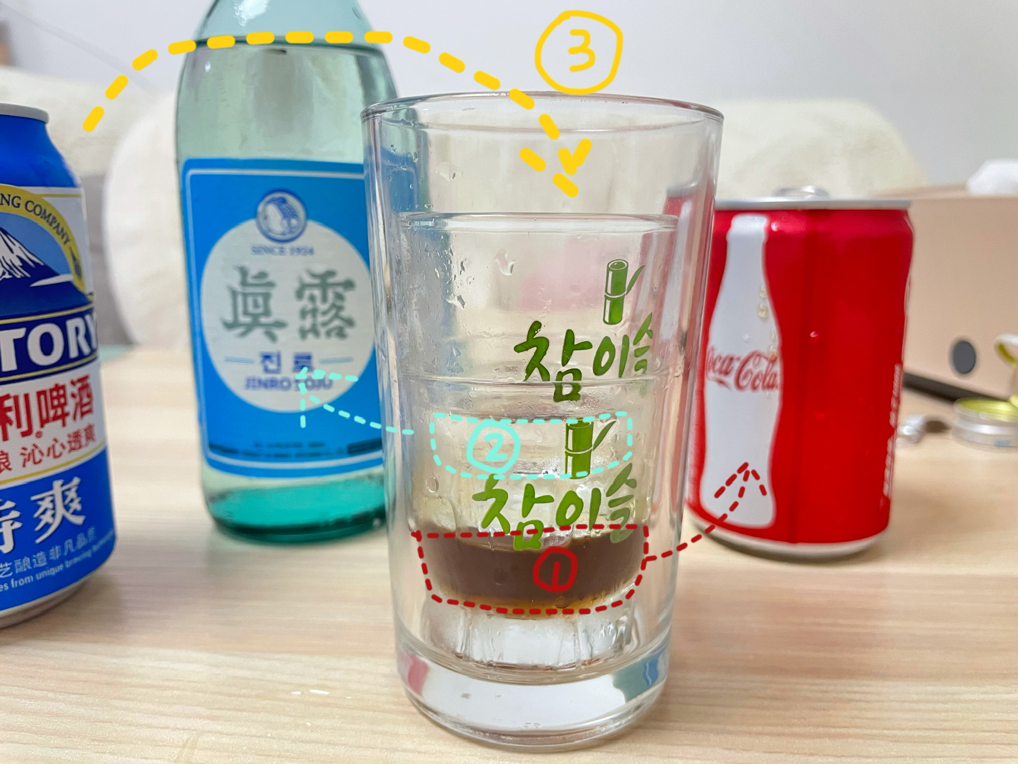 这个是要一口闷的,这样才能尝到烧酒的苦-啤酒的清爽-可乐的甘甜。才能真正体会到苦尽甘来的感觉~☺️