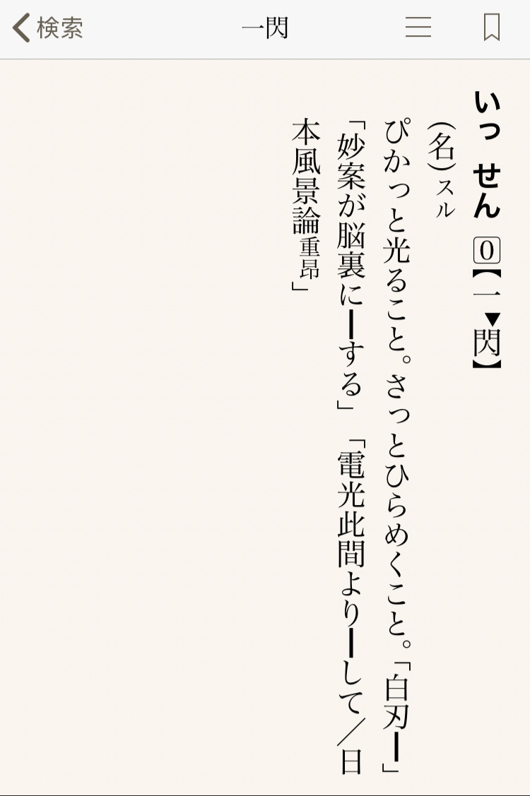 「紫電一閃(しでんいっせん)」:形容事态急速变化;或者刚磨好的刀剑闪出的寒光。