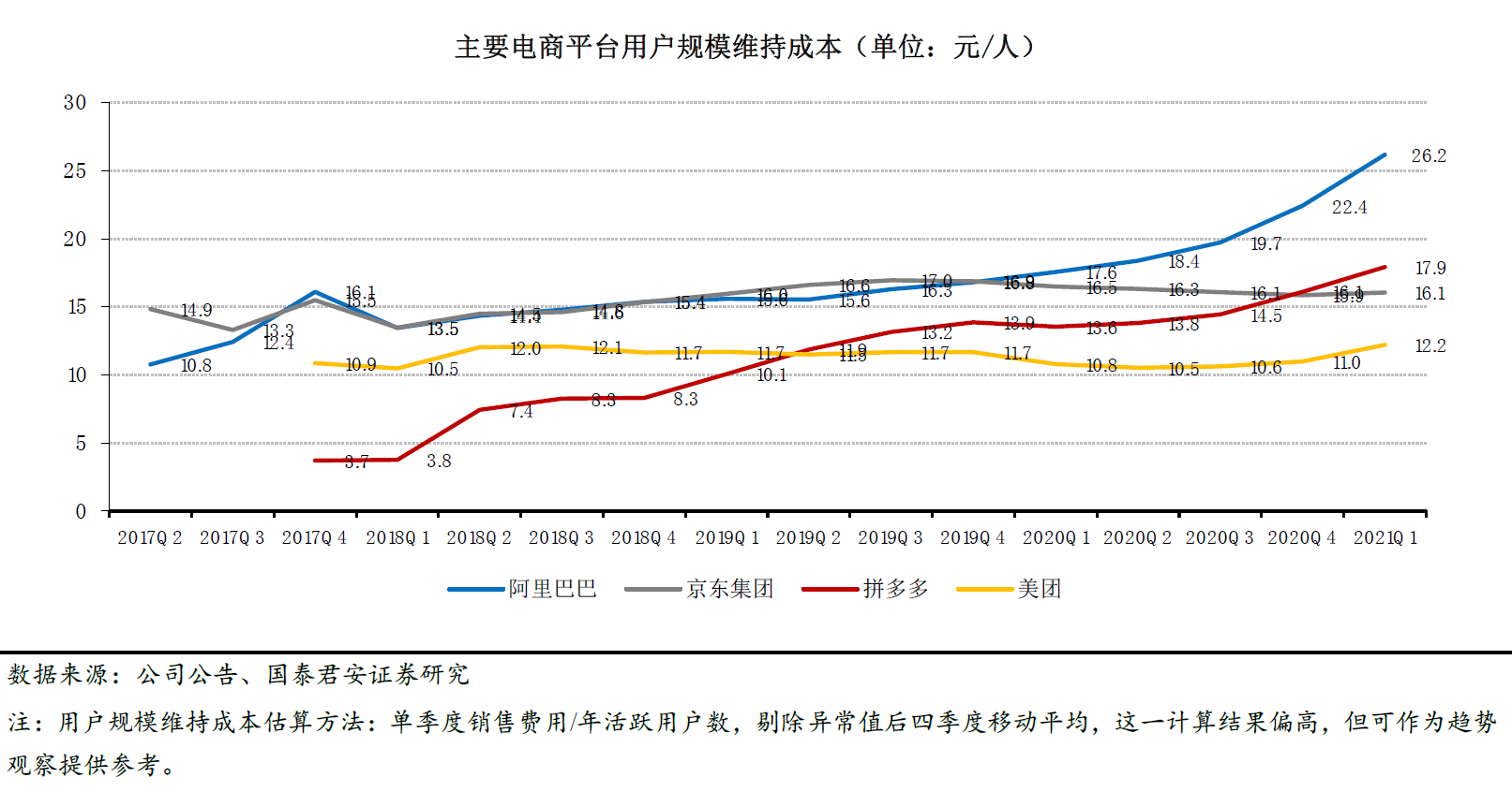 2017-2021阿里巴巴🆚京东🆚拼多多🆚美团单用户拉新成本、用户规模维持成本、新增用户同比增速变化
