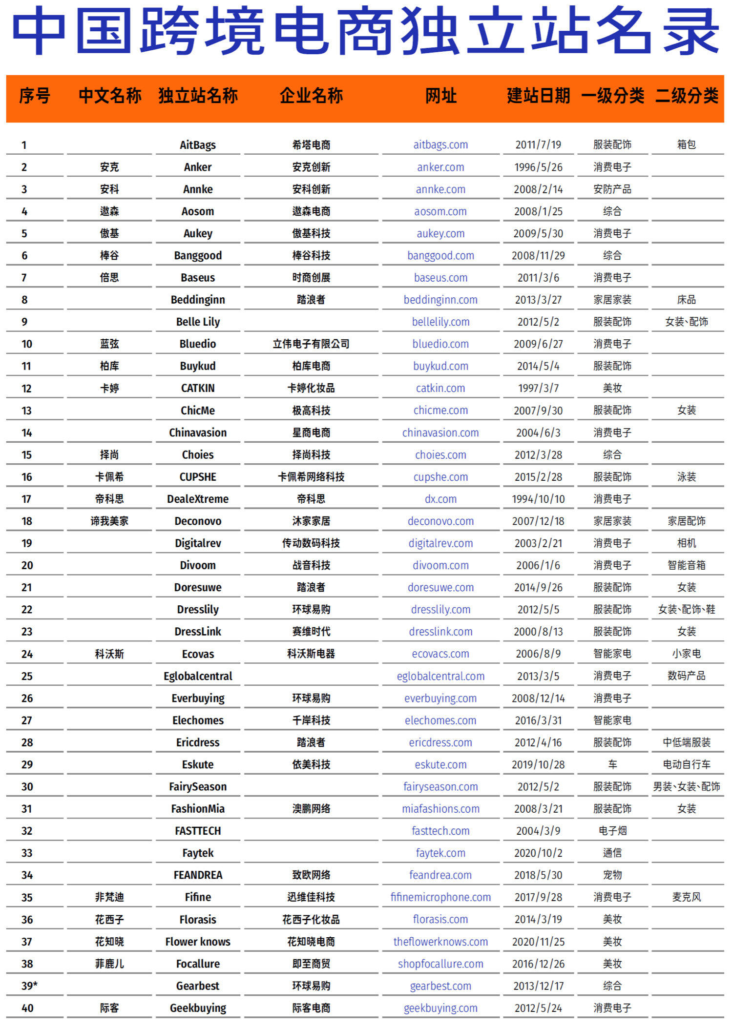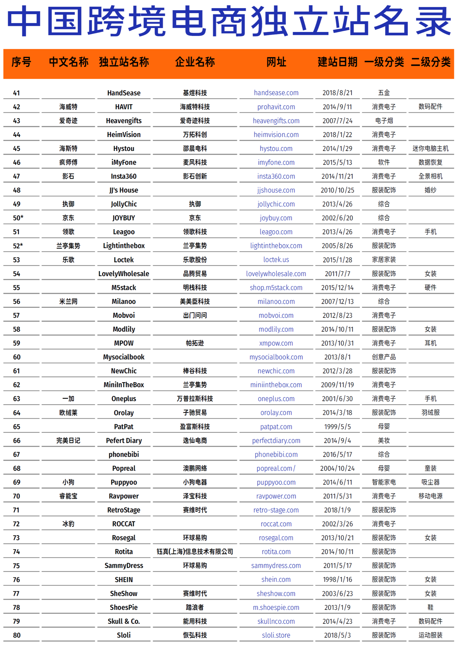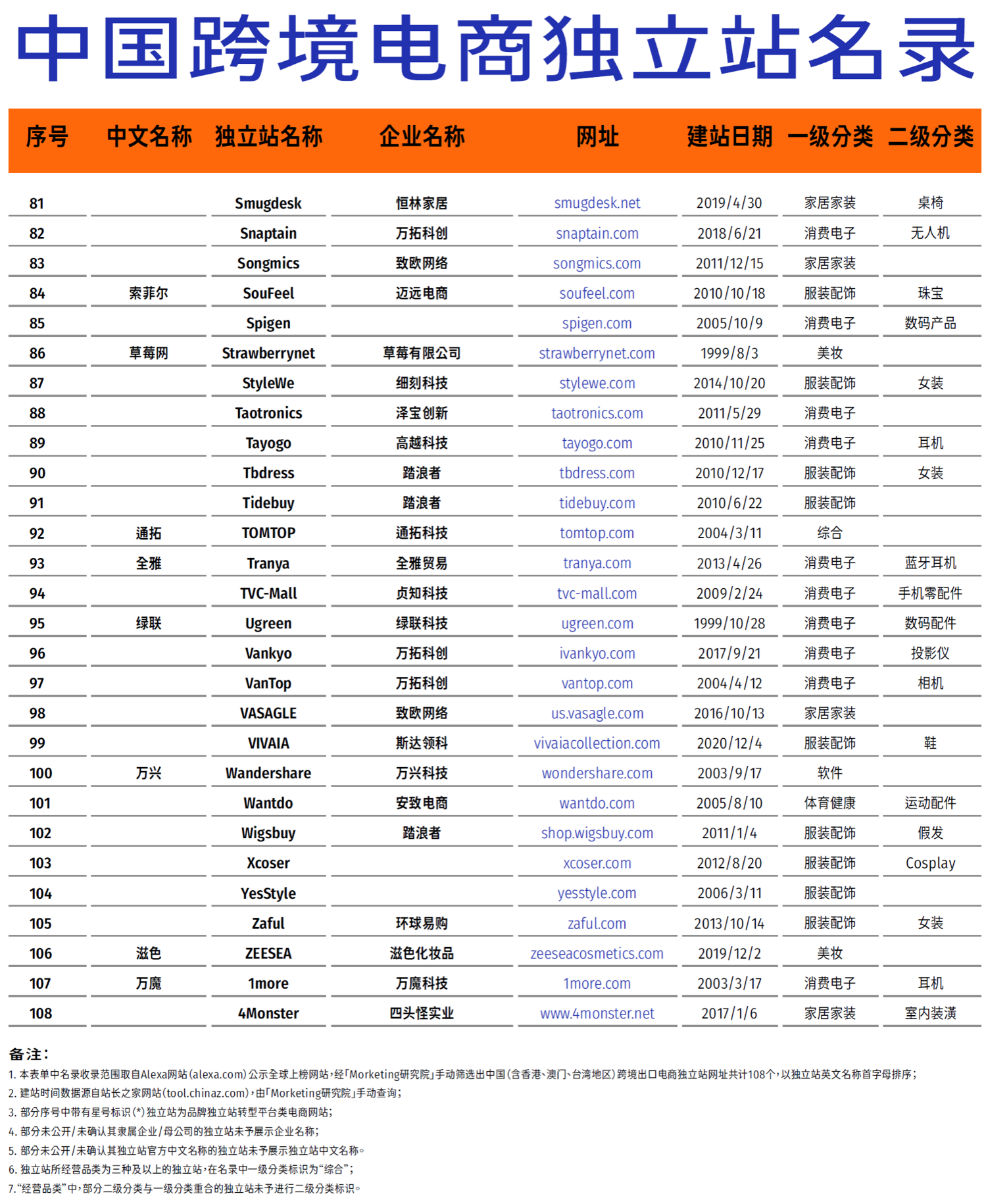 中国跨境电商独立站名录(按首字母排列,共108家,图1⃣️-3⃣️),可以看出中国出海电商独立站基本是以服装配饰和消费电子为主的