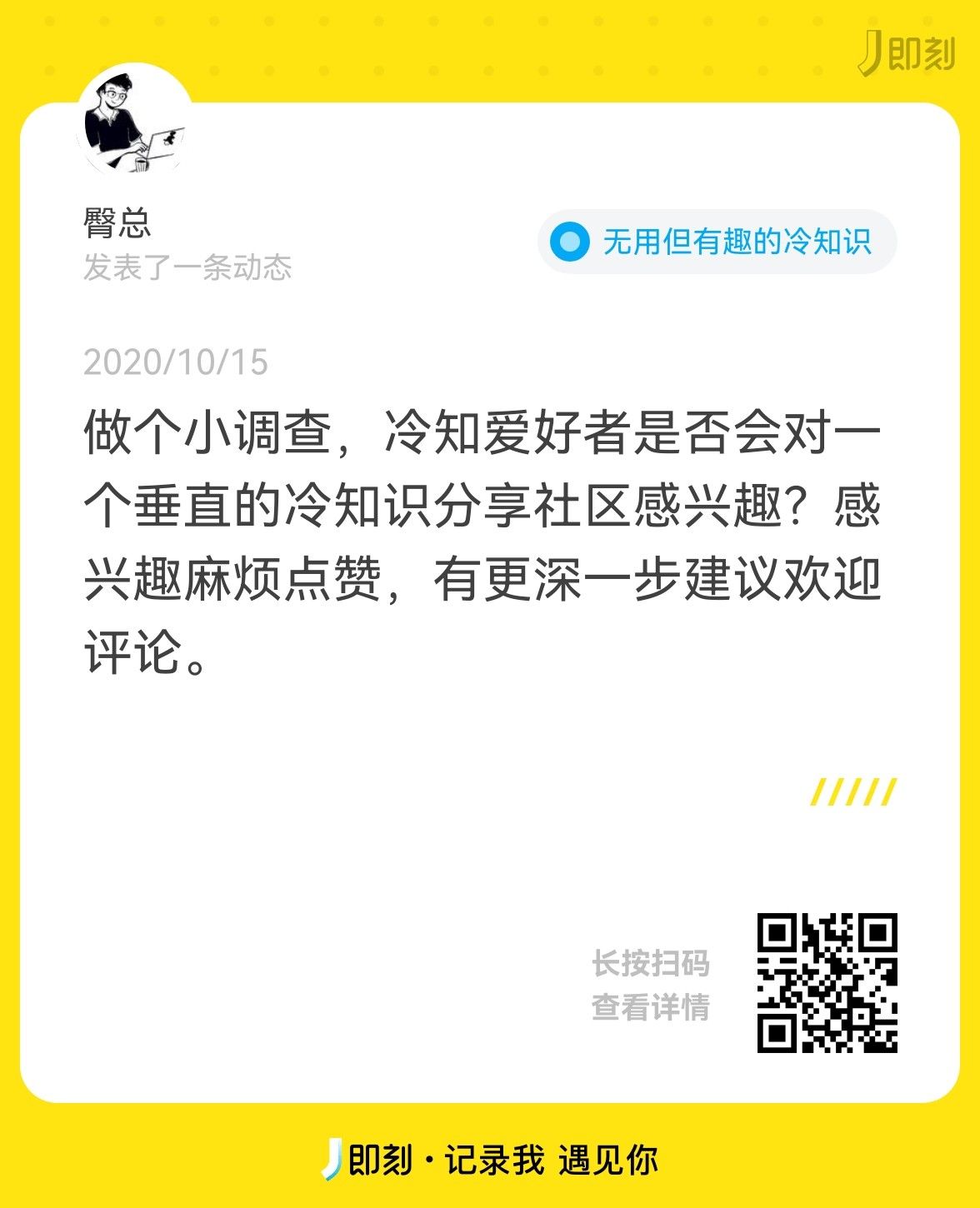 最后,希望「知不知」能成为一个无用但有趣的App,这样一来下面这条动态就非常适合发在这个圈子: