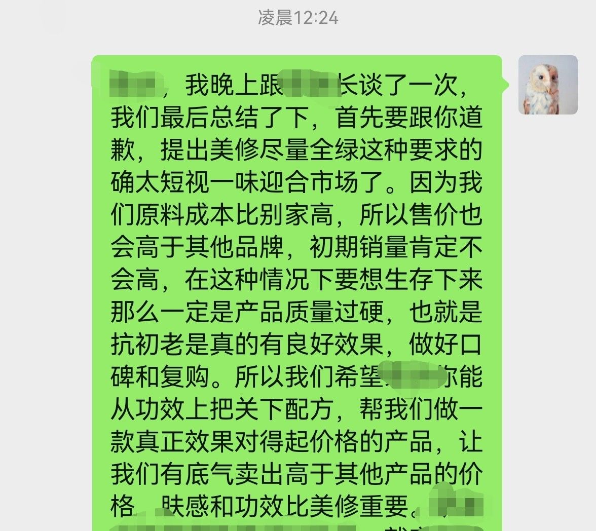 今天半夜给研发负责人(来自清华大学/全球专业排名top 3的UCL生化制药工程系,师从诺奖得主)发信息认错。背景是前期由于美丽修行在成分党中的流行,我一直希望我们成为「美修全绿」、无致痘风险成分、活性物质尽量多的产品,也在向研发提这个需求。但在不断的业内人士调研中逐渐明白这个app的评分体系并不科学,且太多品牌尤其是新品牌被其评价体系绑架。