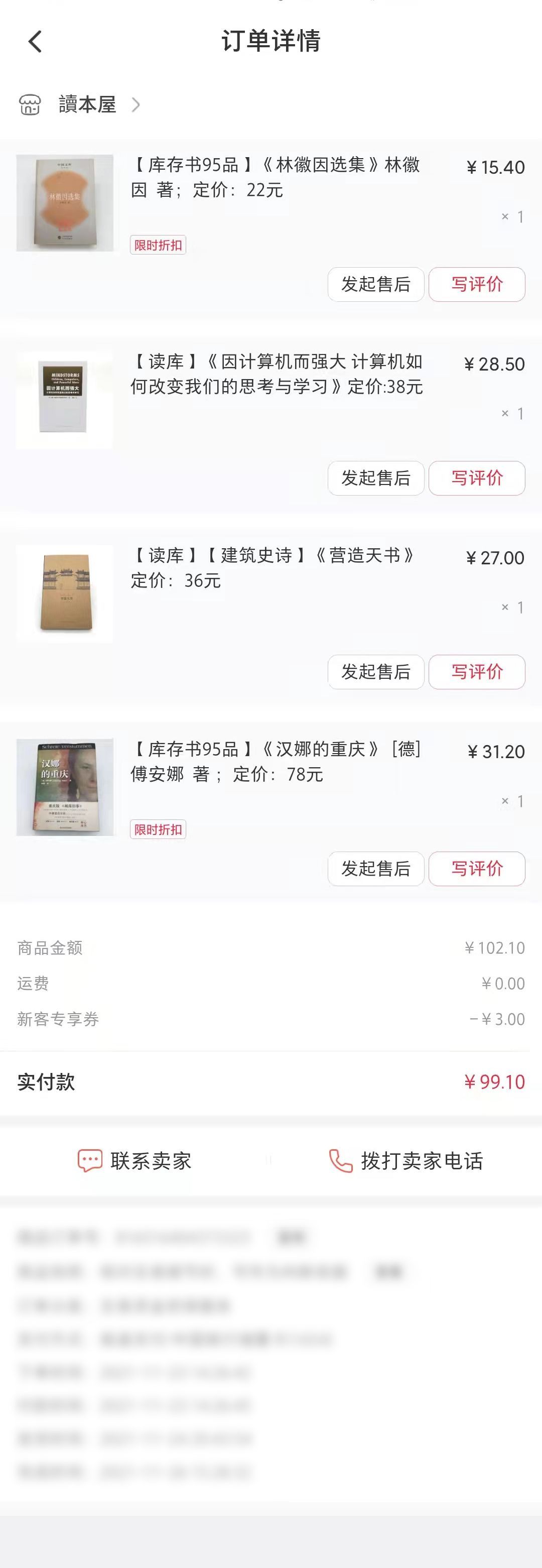 我购买的四本书,共计102元,新用户100-3元,最终99元拿下四本(图2)。