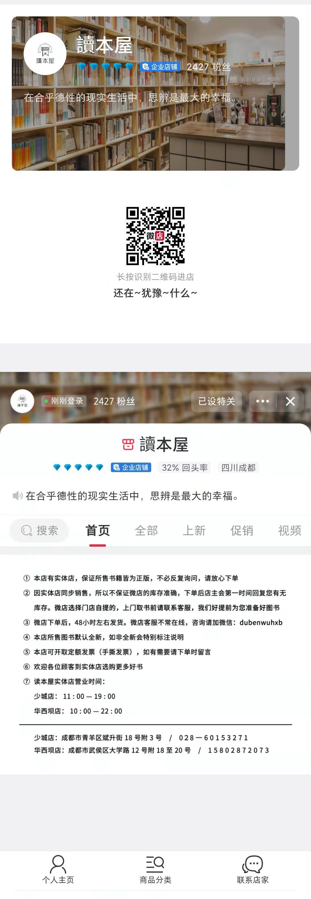 考虑到出行往返所需时间,索性先在读本屋的网店-微店APP上(图1)下单,当做初步了解读本屋的图书状况(听很多网友说读本书屋的书既便宜又是正版,还能找到绝版书,很是好奇)。