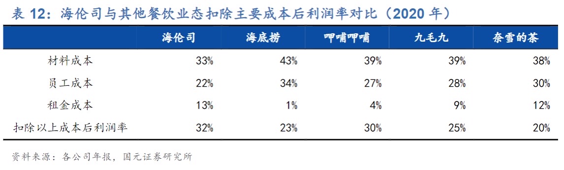 海底捞、呷哺呷哺、九毛九、奈雪的茶、海伦司扣除主要成本(材料成本、员工成本、租金成本)之后的利润率: