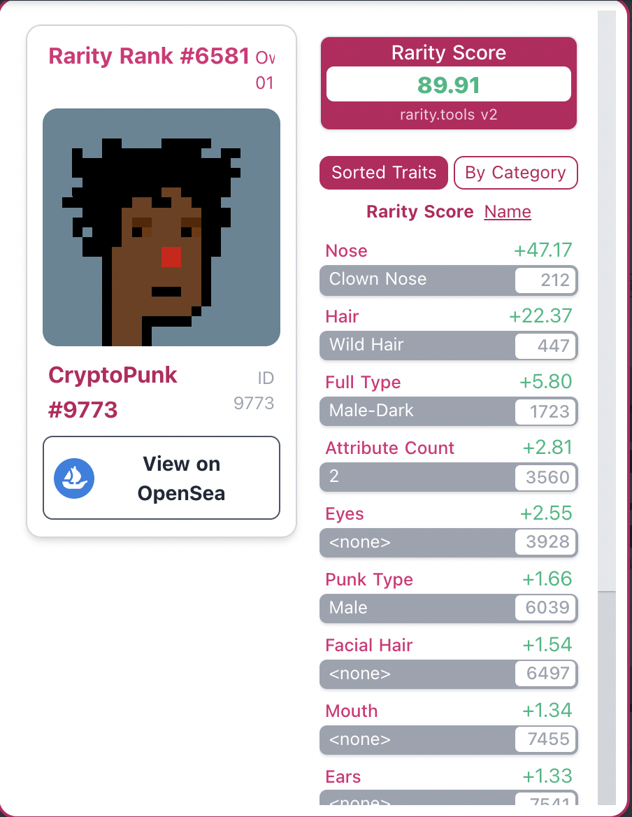 它的全名叫 CryptoPunk #9773,是目前最贵的头像 NFT 系列。如果按稀有度排名,是 Rarity Rank #6581,其最稀有的属性就是它显眼的红鼻子。