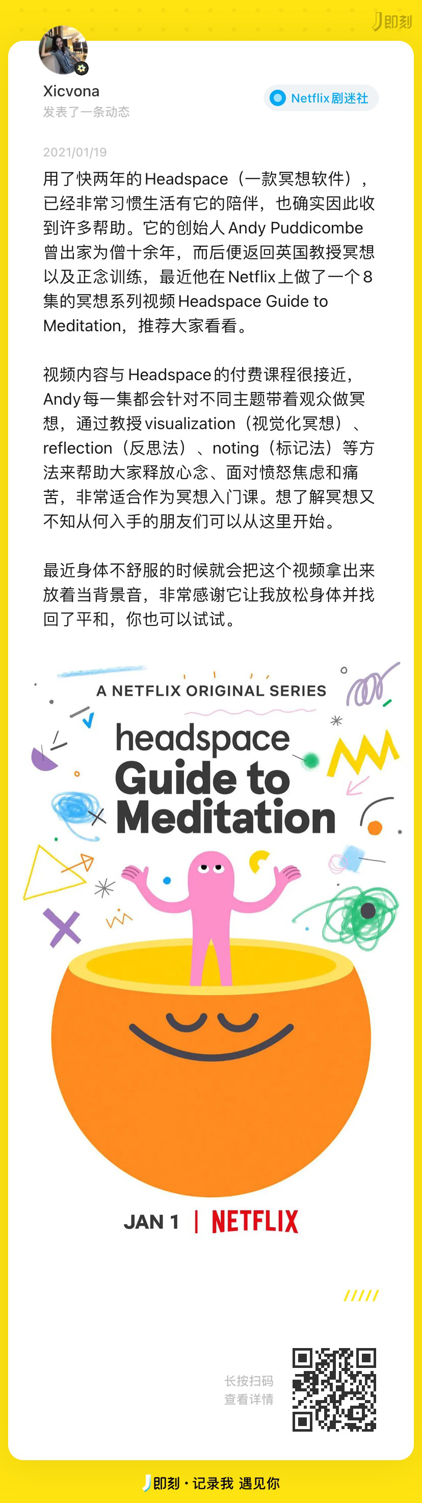 rss.acast.com)和与 Netflix 合作过的冥想系列视频 Headspace Guide to Meditation(B站有),作为 App 的(免费)延伸是不错的选择。