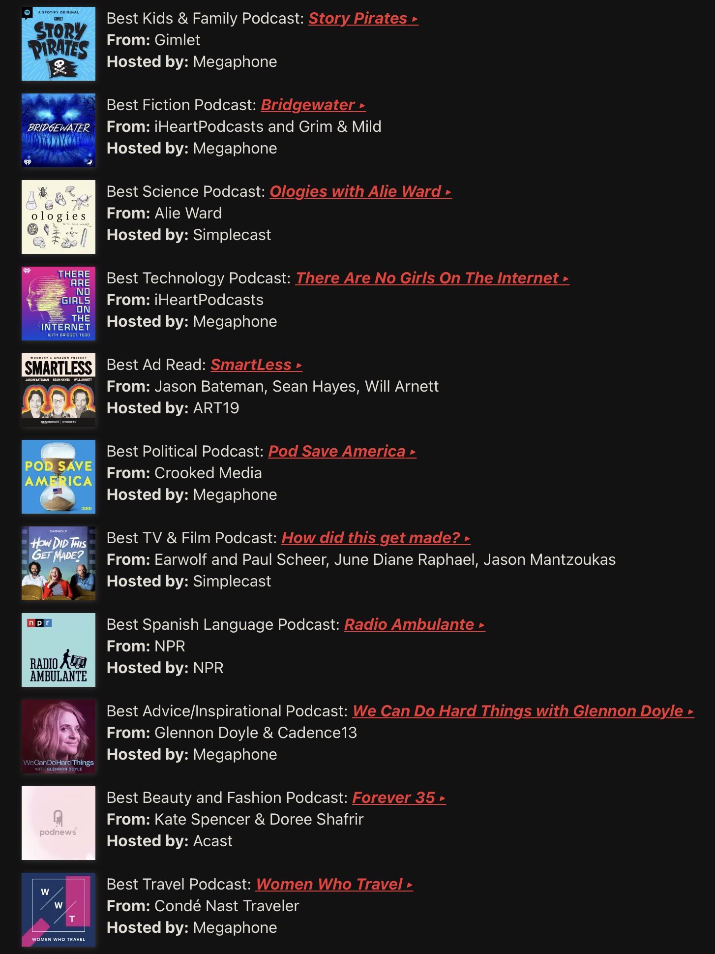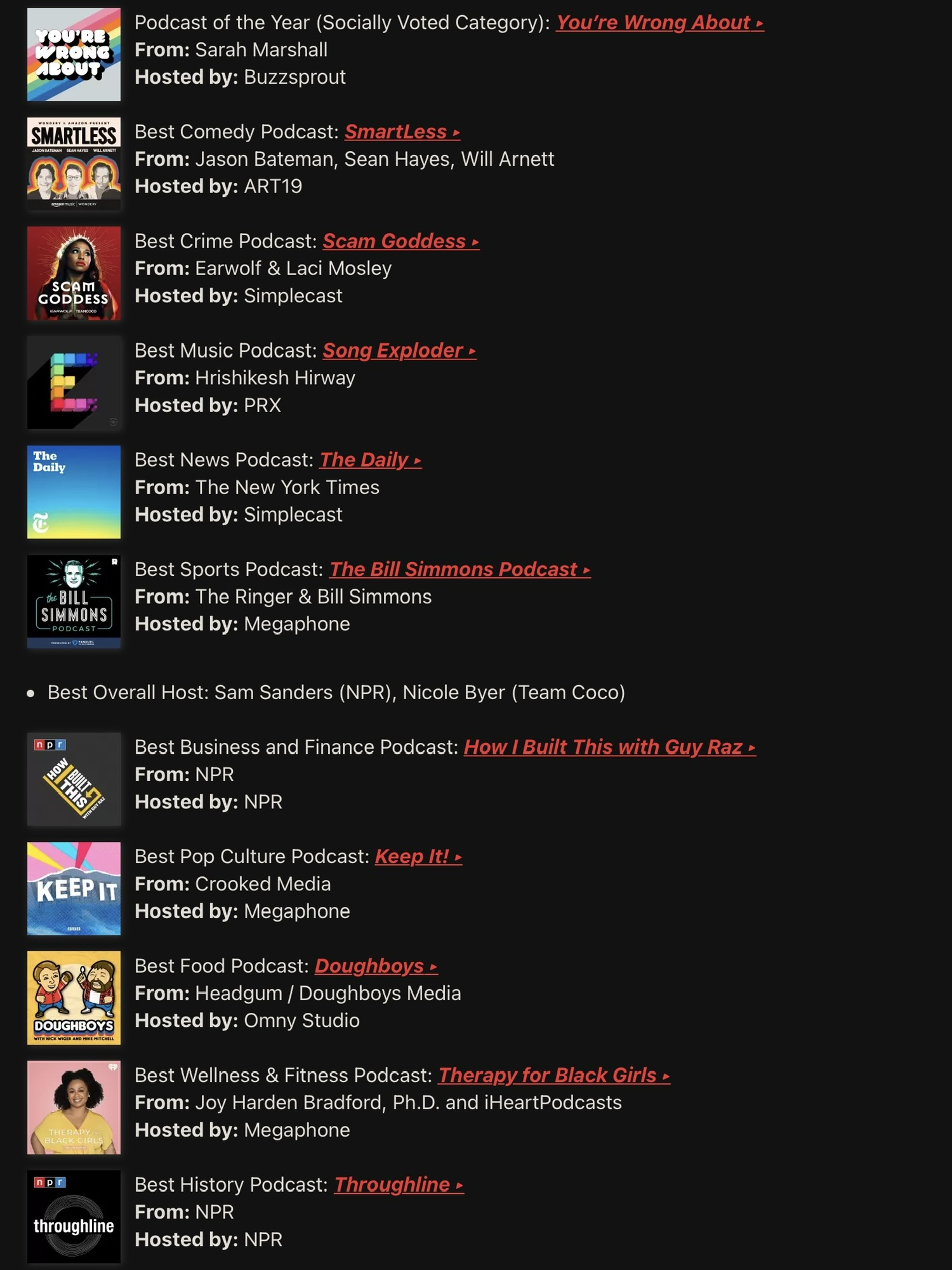 完整名单看下图。不过居然还有 Best Ad Read 这个品类,口播读得最好的播客?好奇了。