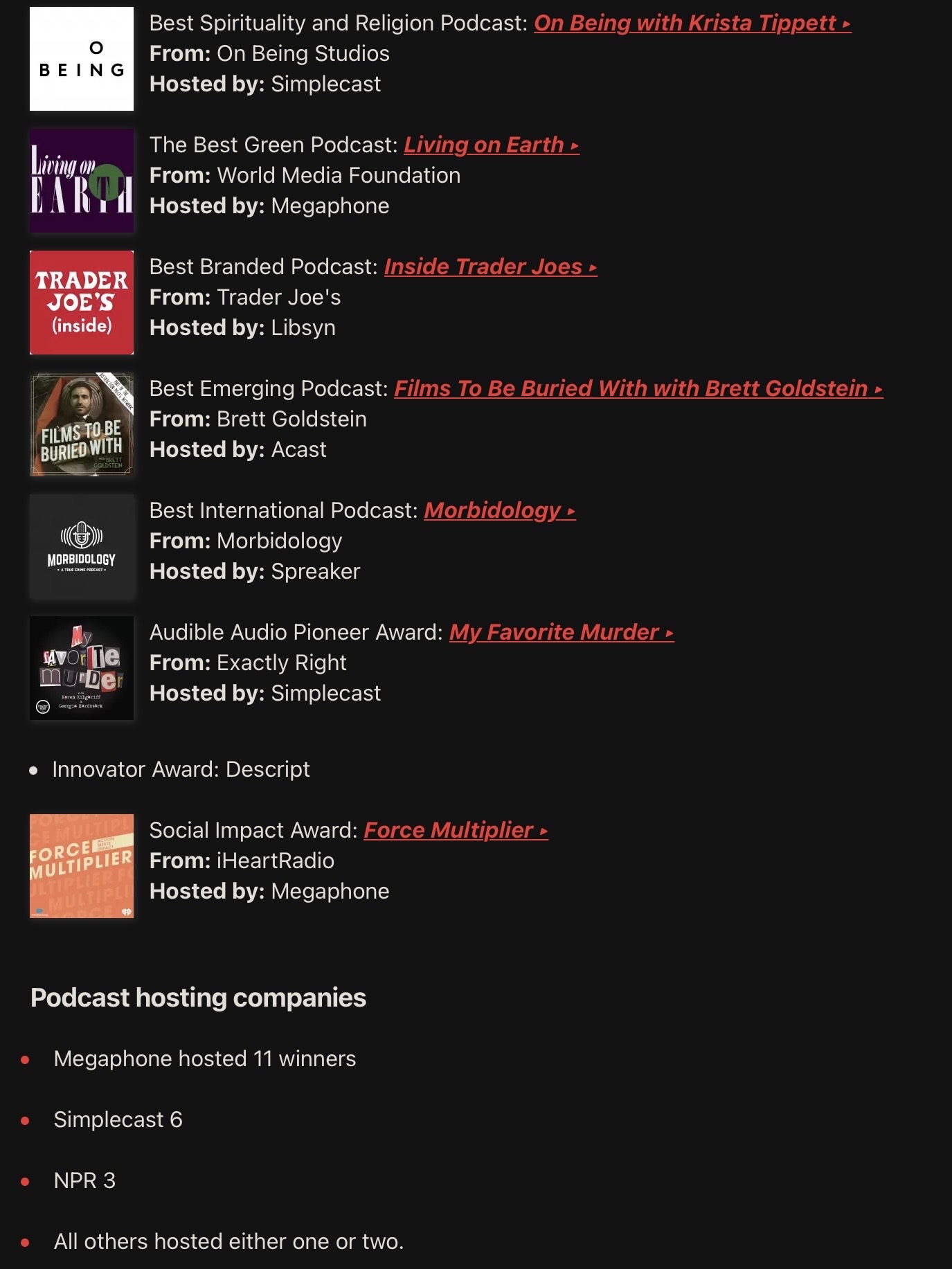 iHeartRadio 这两天宣布了 2022 年度 Podcast Awards 的29 位获奖得主。