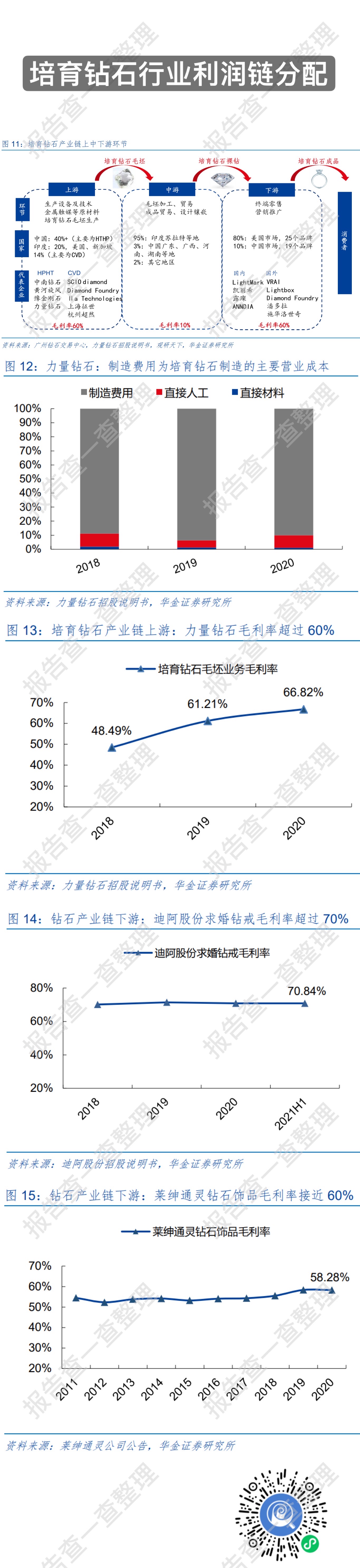 涵盖生产设备和技术、金属触媒粉等原材料和培育钻石毛坯的生产制造,根据贝恩《2020-2021 全球钻石行业报告》,2020 年,全球培育钻石毛坯产量约 720 万克拉,我国产量达 300 万克拉,占比超过 40%。由于上游环节具备一定的原材料技术和资金壁垒,因此享有较高的利润率水平,据力量钻石招股说明书,2020 年力量钻石的培育钻石毛坯制造环节毛利率超过 60%,设备折旧、电力等制造费用为主要成本。