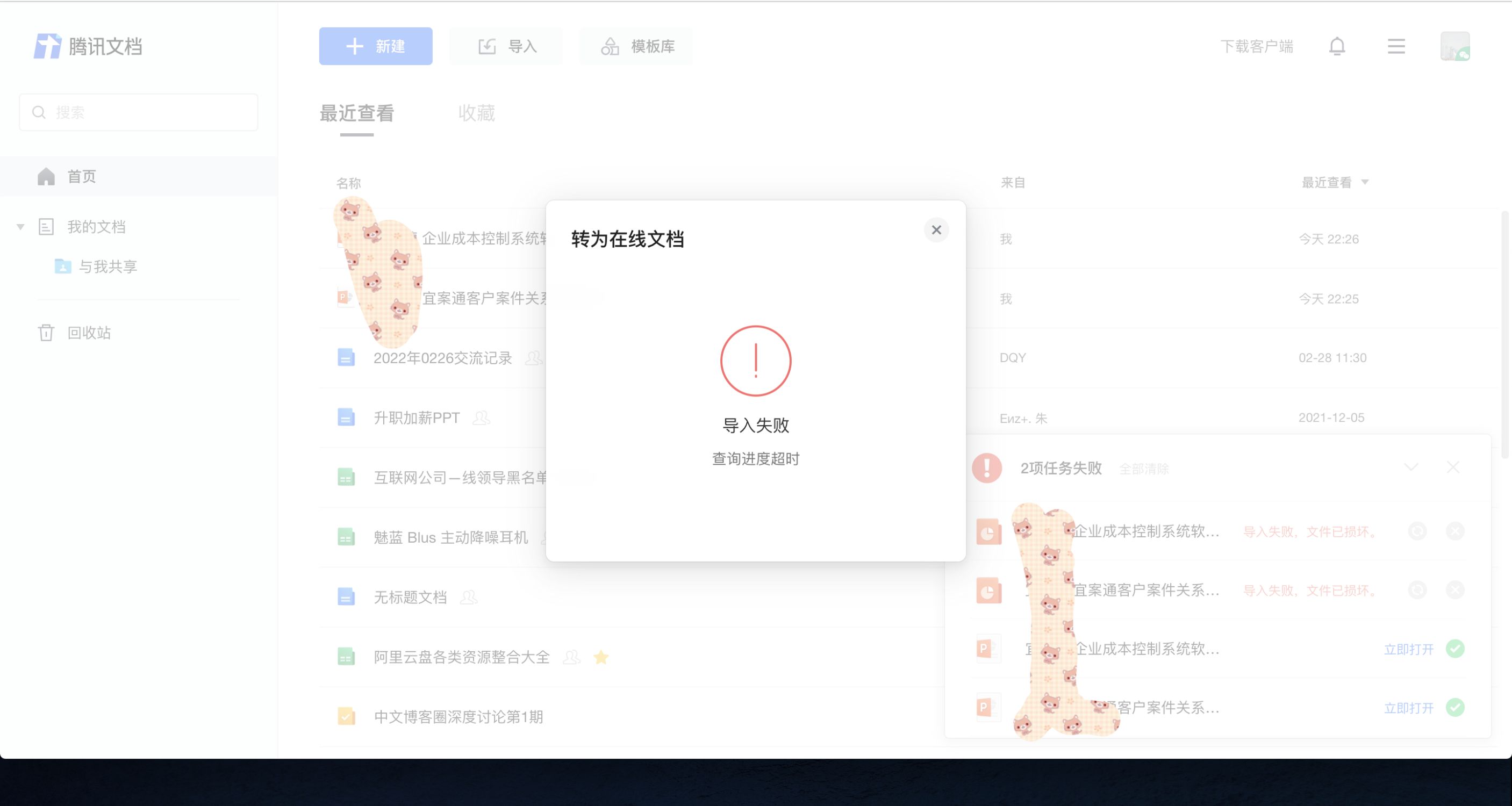 3.尝试点击企业微信的"文档"Tab,我在Mac上网页版传的幻灯片,选择仅上传而非导入,手机端企业微信的文档功能的"腾讯文档导入"居然不显示,收藏也看不见,并且在线转换提示查询超时,直接传Keynote导出的PPT文件时,文件已损坏只能将文件选择"导入"才可以显示。
