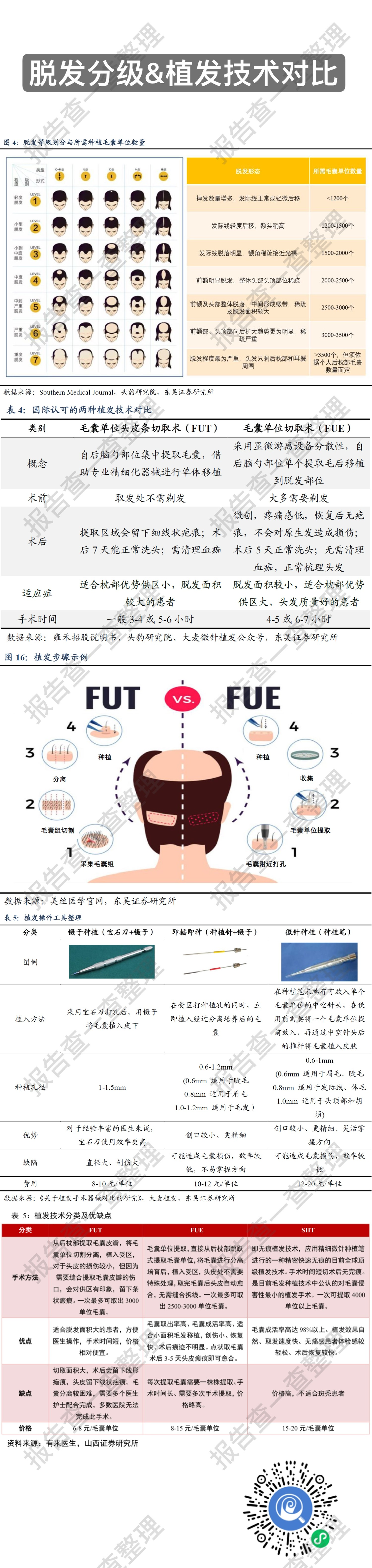 这组图表给出了不同脱发等级所需毛囊数量以及不同植发技术、植发工具所需的植发费用