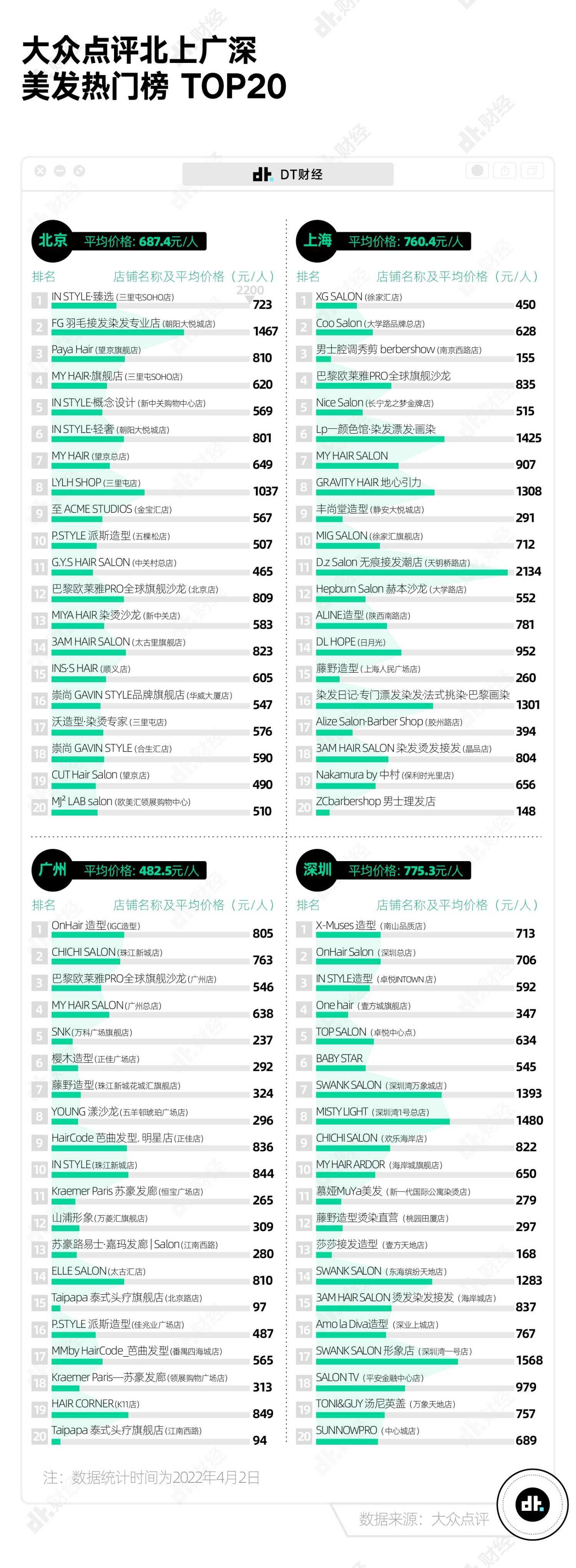 其次是上海,美发热门TOP 20店铺平均价格达到760.4元,北京是687.4元。而就算是价格最亲民的广州,要去TOP 20店铺美发,人均消费价格也达到了482.5元。