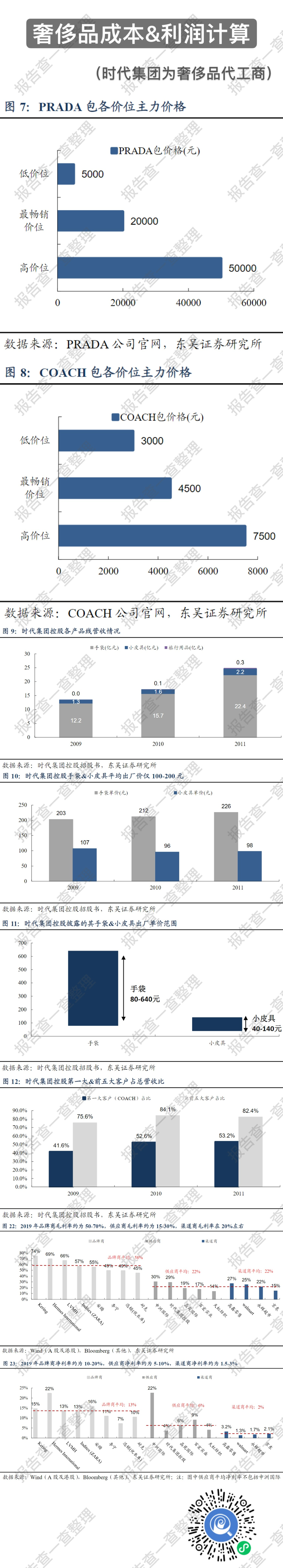 根据奢侈品代工商时代集团控股(主要代工品牌:PRADA、COACH、MK等)招股书中披露的信息,其代工的奢侈品包,出厂价格平均销售单价为【200-230 元】,而小皮具(比如钱包、化妆包等)的平均销售单价为【95-110 元】。