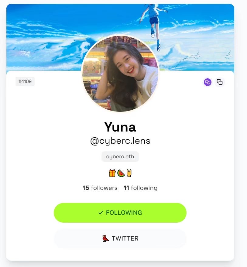 协议上已经有不少的项目冒出来了,比如Lens团队先写的一份示例作业LensFrens,是一个web3的足迹聚合器,我们挑选了一个漂亮小姐姐🧚♂️Yuna,可以很轻松的点击跳转到她的twitter,opensea主页以及polygonscan数据(小姐姐还挺勤快的,交互好多啊)🤩