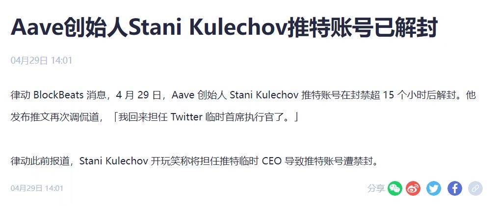 这个项目最早受到关注是因为Aave团队创始人Stani疯狂背书,我想他是真的需要,毕竟因为在推特上嘴贱说自己要出任twitter临时CEO被禁言了15天,账号恢复之后还忘不了损一把。🤣🤣