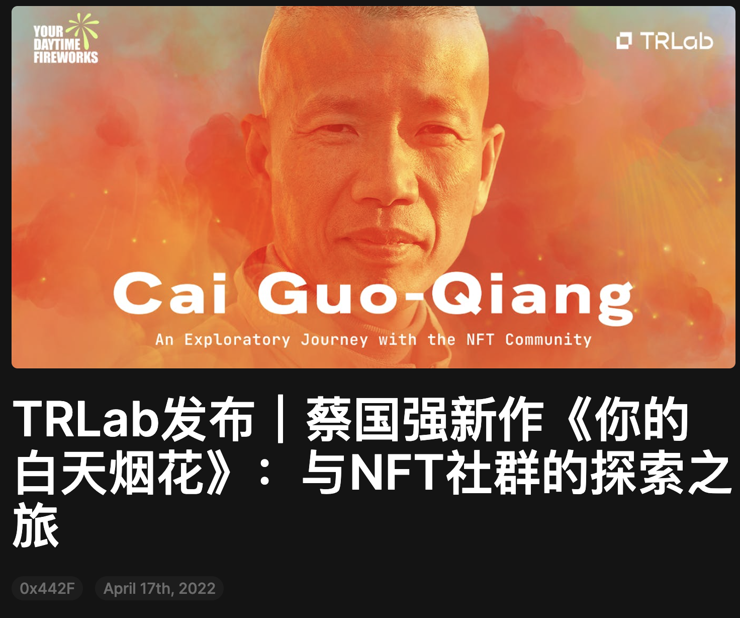 2️⃣TR Lab,BAI合伙人Will可能是它的野生代言人。第一个发行的NFT就是和蔡国强大师合作的烟花,一出生就有上海外滩美术馆支持,软文都是凤凰艺术这样的正统媒体,打开推文也是浓浓的高逼格审美。那么创始人欧晋翘是谁?众安在线(06060.HK)董事长欧亚平的女儿👧不折不扣的富二代、创二代。为什么有上海外滩美术馆的支持?那是人家里的资产。联创也不简单,李昕,佳士得全球非执行副主席。🎆烟花 🔗: