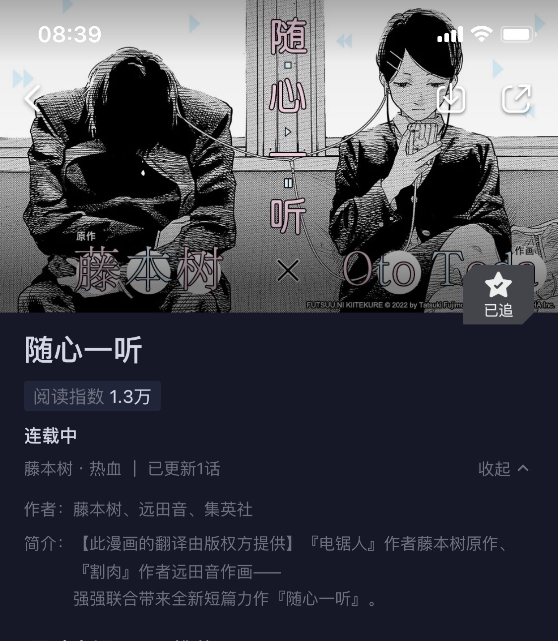 藤本树新短篇,这次阿b真速度,作画远田老师应该有模仿藤本的画风吧还挺像的,内容很短有点似曾相识也没少了坏女人和好耶,看完意犹未尽的感觉少了神秘女生的后续,不过就还是不过度解读了