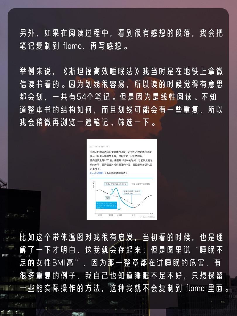 所以我一般会最后把所有划线的地方看一遍,挑选一下,大概也是10-20条的数量,复制到flomo,不会一下子全部导进去,不然后面看笔记的时候,就会发现被电子书的笔记淹没了🥲。另外,如果在阅读过程中,看到很有感想的段落,我会把笔记复制到 flomo,再写感想。