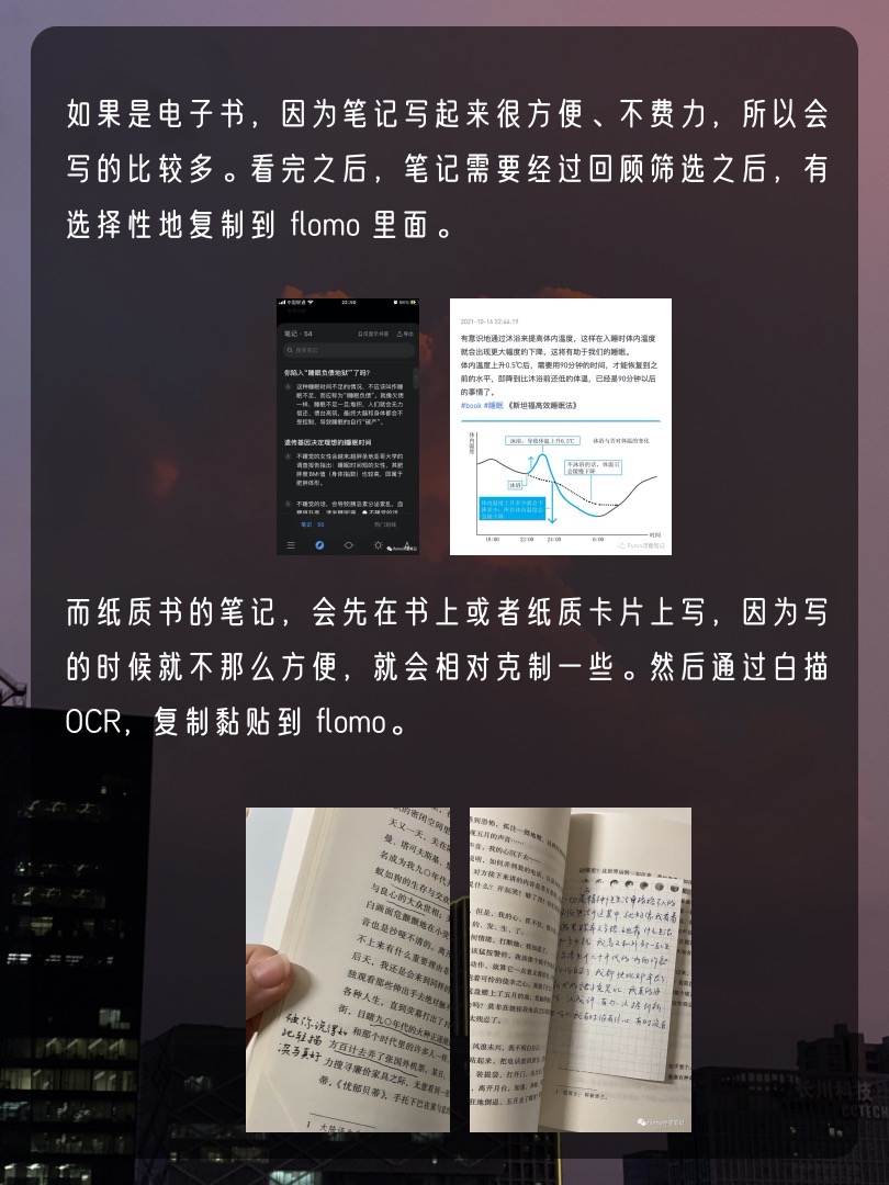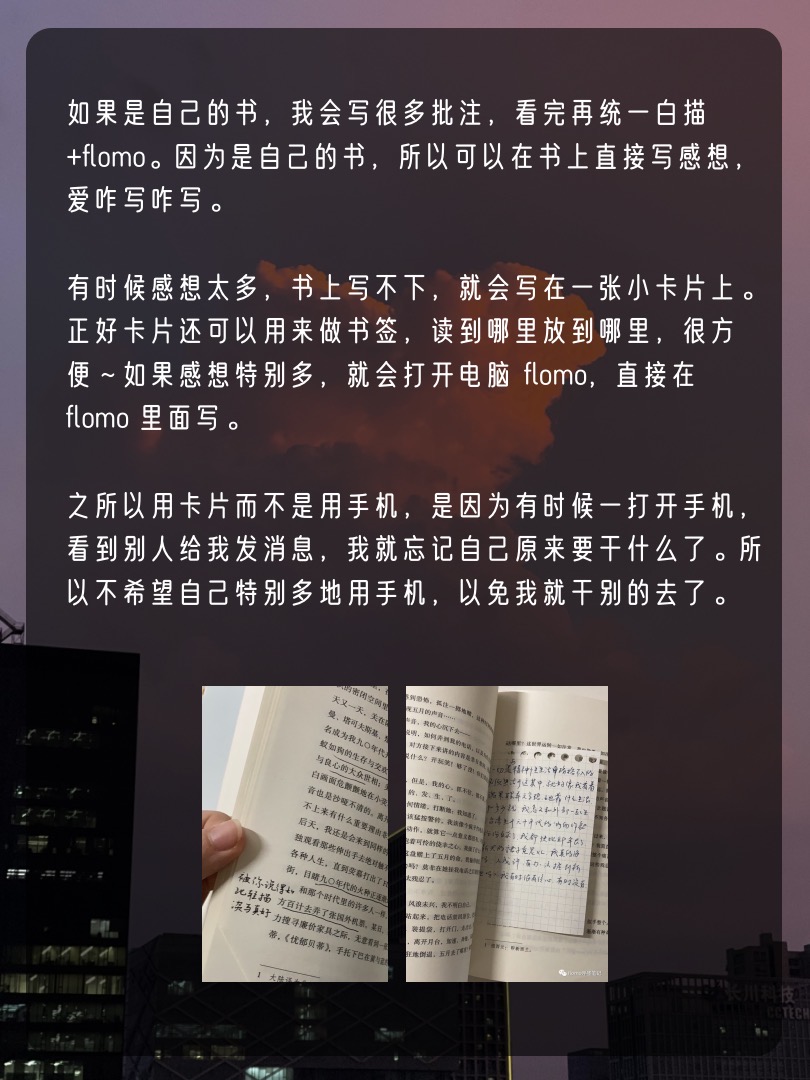 而纸质书的笔记,会先在书上或者纸质卡片上写,因为写的时候就不那么方便,就会相对克制一些。然后通过白描OCR,复制黏贴到 flomo。