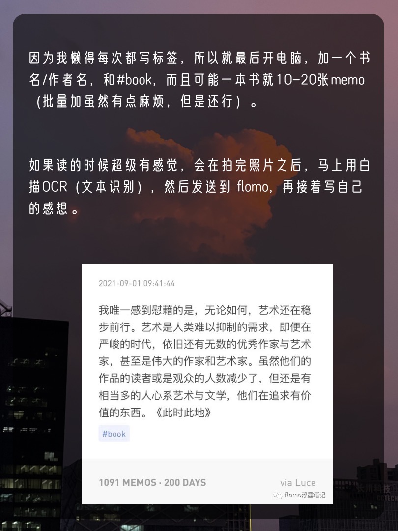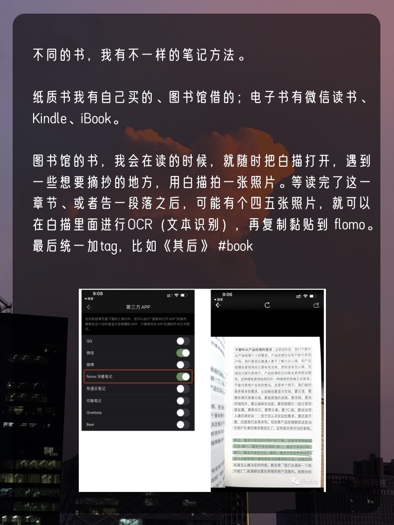 📕图书馆的书,我会在读的时候,就随时把白描app打开,遇到一些想要摘抄的地方,用白描拍一张照片。等读完了这一章节、或者告一段落之后,可能有个四五张照片,就可以在白描里面进行OCR(文本识别),再复制黏贴到 flomo。最后统一加tag,比如《其后》 #book 。