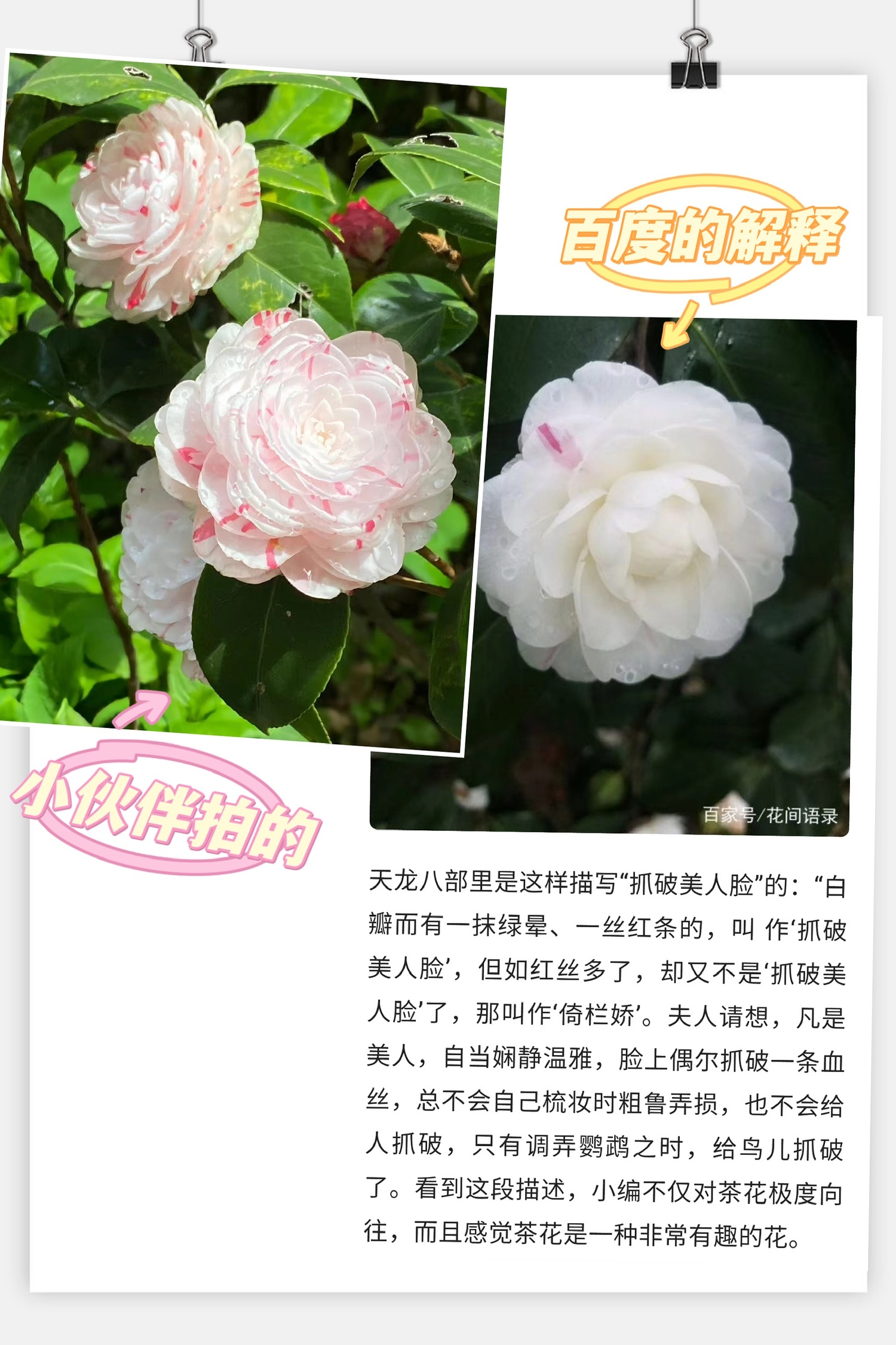 灵感来源于这个小伙伴闲逛时路上拍到的一株惊为天人的茶花,立马让人回忆起小时候金庸天龙八部里的这个场景(图四),就是红斑有点多,不然我更想叫它“抓破美人脸”😋