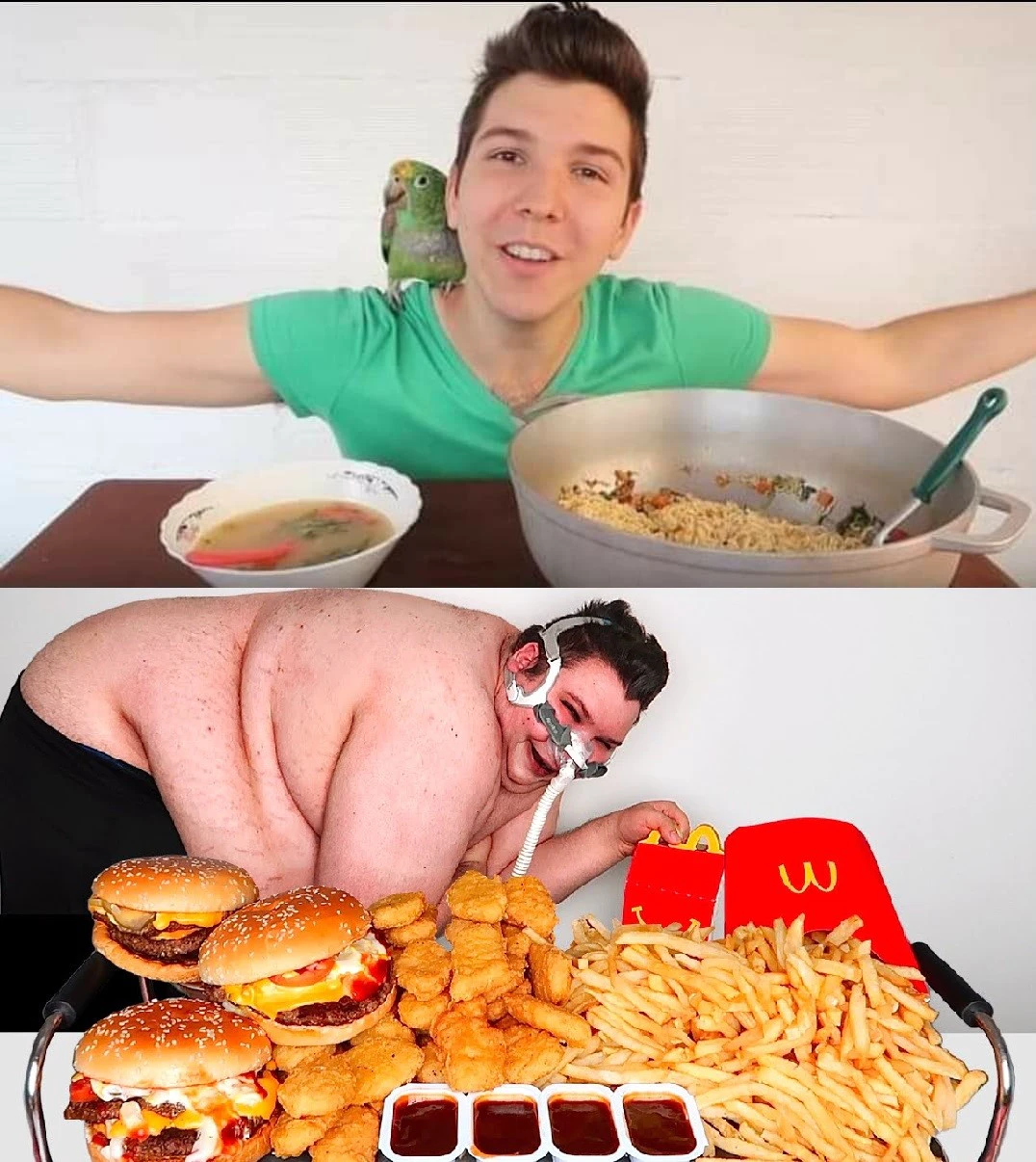 很快,他的视频评论区就有粉丝开始挑战他做出更为出格的吃播行为。他意识到,只有通过满足这些粉丝的猎奇欲望,他才能获得更多的流量,于是他开始在粉丝的挑唆下不断地挑战各种人类的极限,直到他变成了下图中这个体重超过160公斤的怪物 -Nikocado。