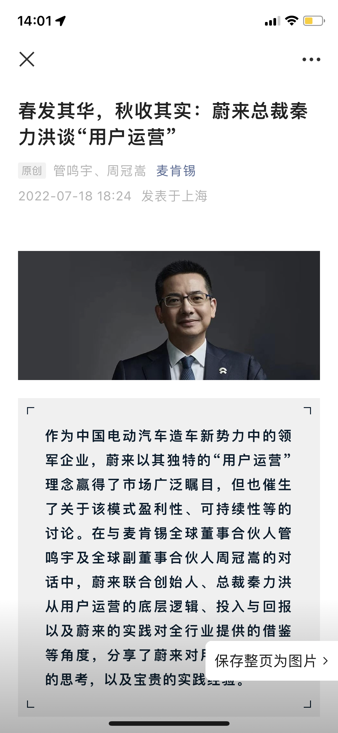 - 在公众号文章页面截屏,右下角会弹出一个按钮「保存整页为图片」。