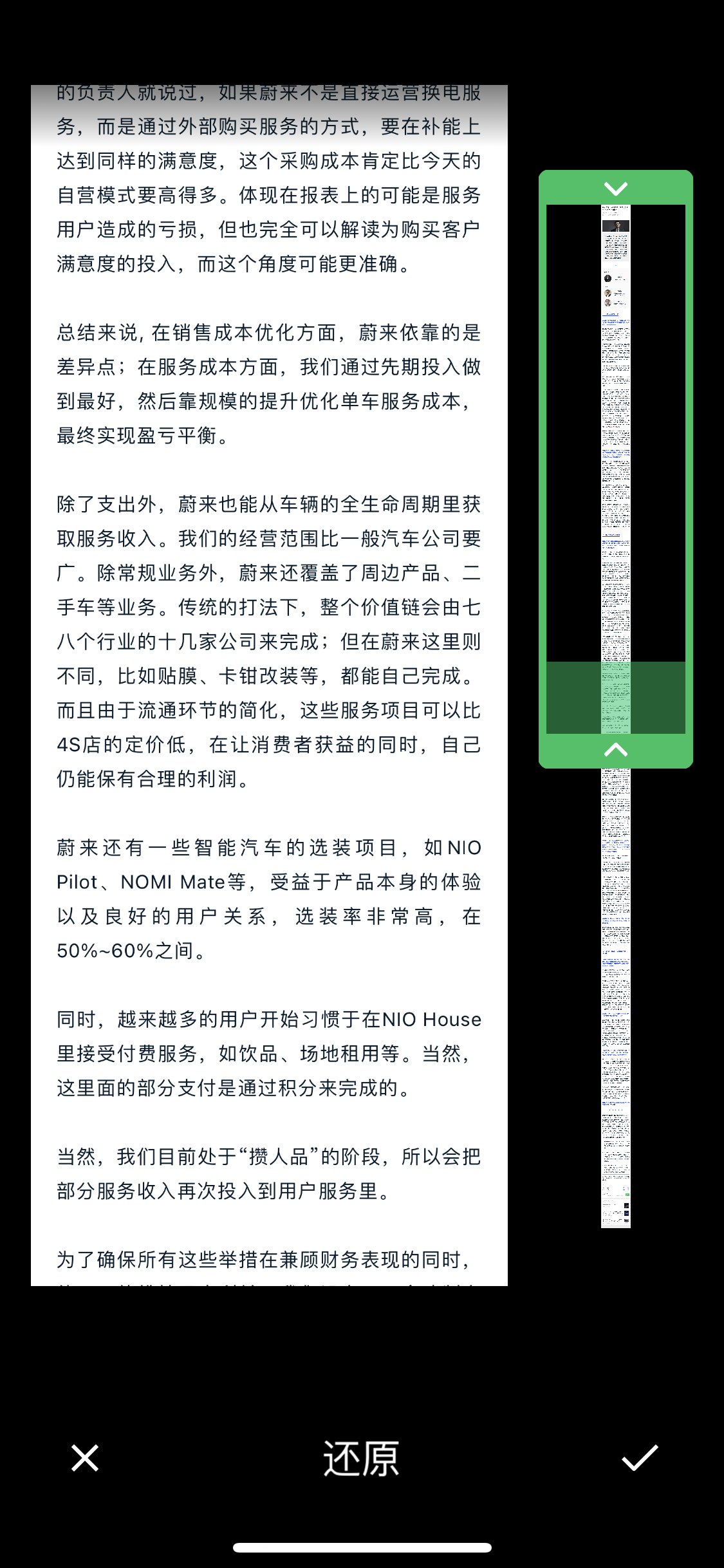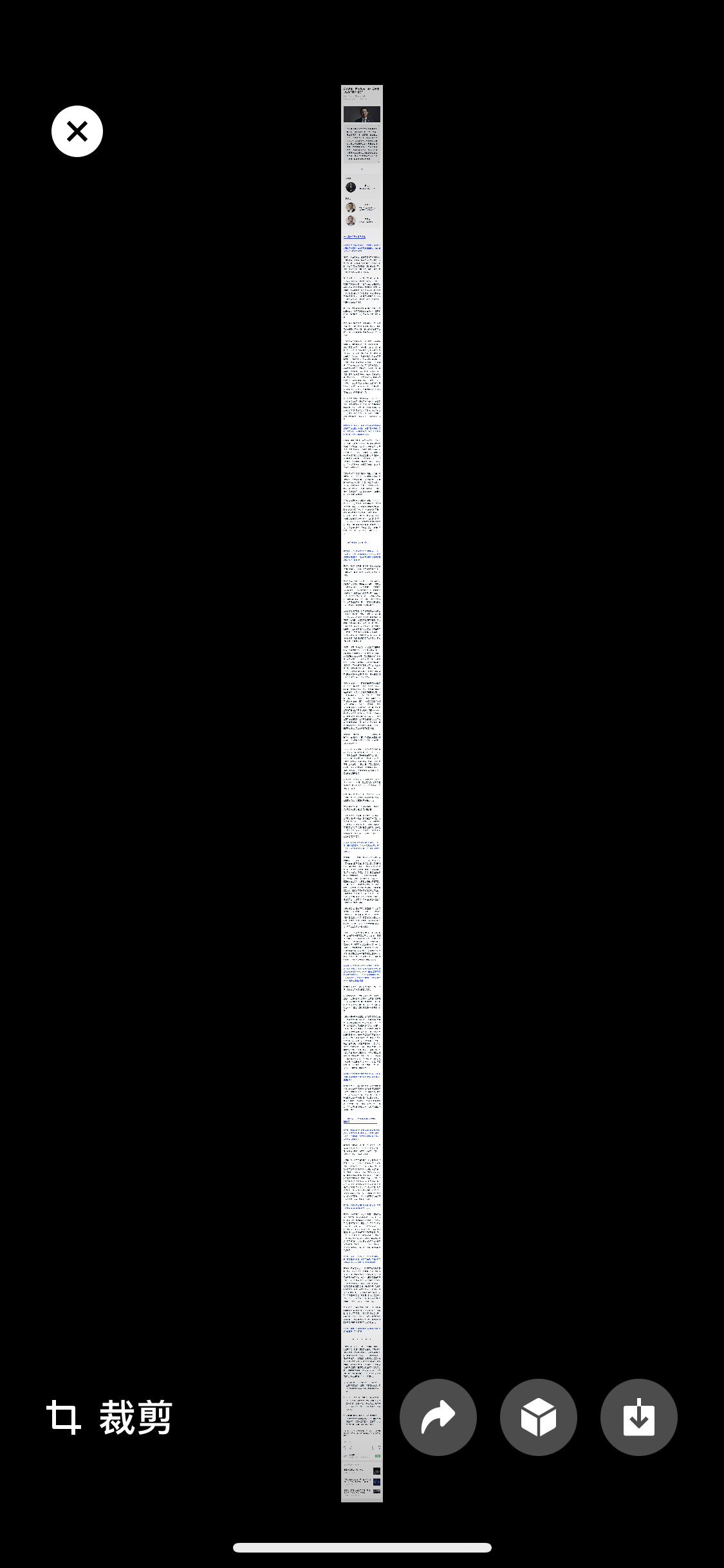 - 点「裁剪」就能像裁剪照片那样,截取长图的一部分保存。这个界面会左右分屏,右边是长图选择区域,右边会显示对应部分的文字,方便定位裁剪。