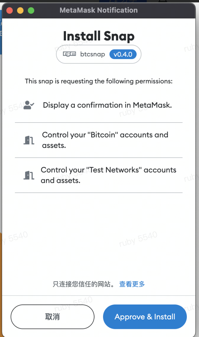 metamask.io先下载沙箱版的metamask flask,再打开一个snap网址(比如keystone的Bitcoin Snap 🔗