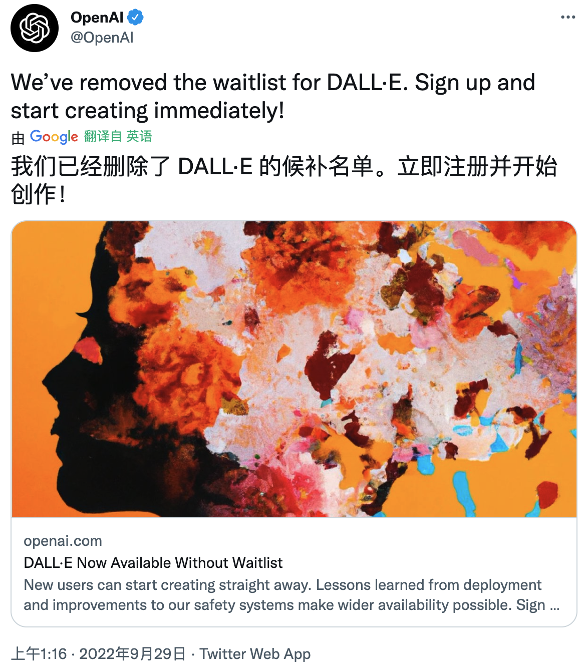 Open AI 官宣了! Dall·E 继上个月 Beta版之后,完全开放注册了。