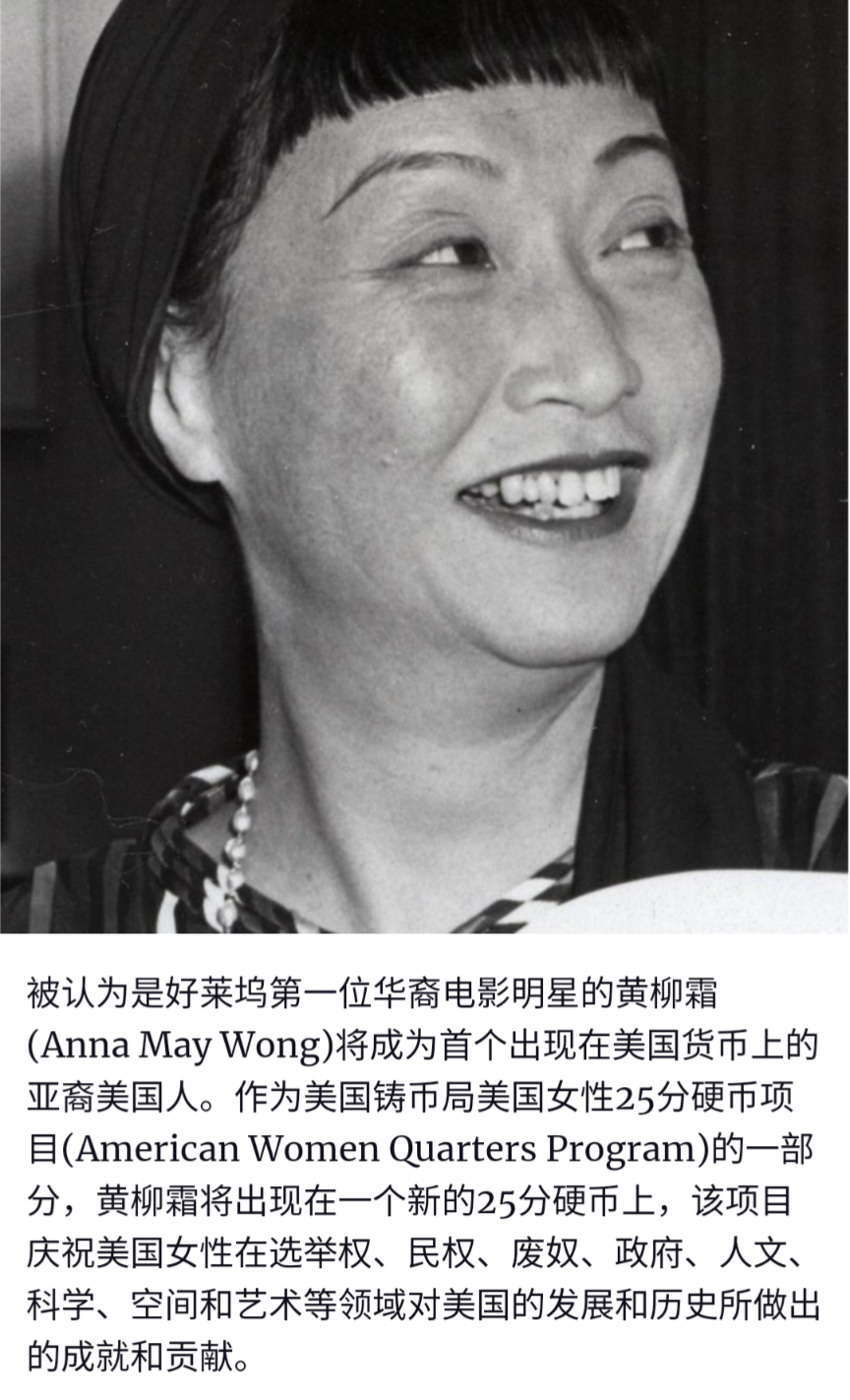 被认为是好莱坞第一位华裔电影明星的黄柳霜(Anna May Wong)将成为首个出现在美国货币上的亚裔美国人。